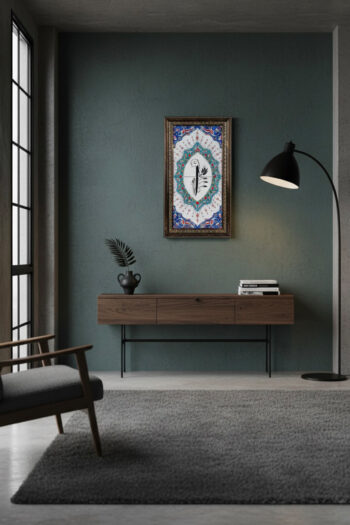 Tablonun merkezinde, siyah rengin asaletiyle yazılmış, manevi derinliği temsil eden zarif bir kaligrafik motif olan Elif harfi bulunmaktadır. Bu motif, mekânınıza huzur ve anlam katacaktır.