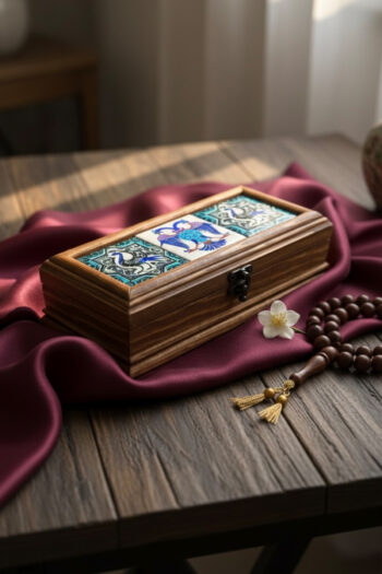 Manevi değerlerinizi ve özel aksesuarlarınızı hak ettiği özenle koruyun. Bu kutu, klasik Osmanlı çini motiflerini doğal ahşabın sıcaklığıyla buluşturarak her mekana estetik katıyor. Kutunun kapağında, beyaz ve mavi tonlarının hakim olduğu, el işçiliği çini panel bulunuyor . Bu desende, tavus kuşu ve geometrik desenlerin zarif birlikteliği geleneksel İznik/Kütahya çini sanatının en güzel örneklerini yansıtıyor.