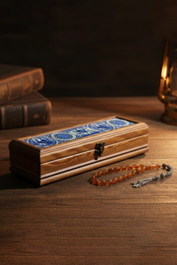 El Yapımı Çini Karo Baskılı Ahşap Tespih Kutusu (5x25cm)