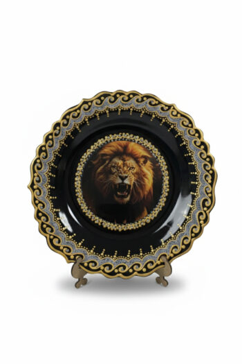 El İşi Gümüş ve Altın Desenli Aslan Motifli 30 cm Çini Tabak