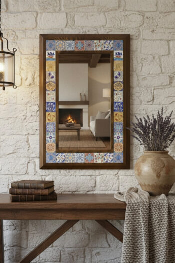El Yapımı Ahşap Çerçeveli Etnik Desenli Çini Karolu Ayna