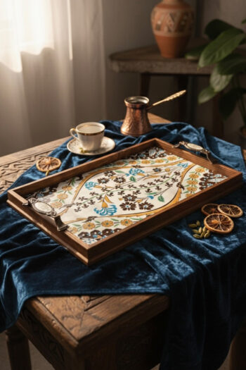 El Yapımı Ahşap Çerçeveli Çini Baskılı Sunum Tepsisi