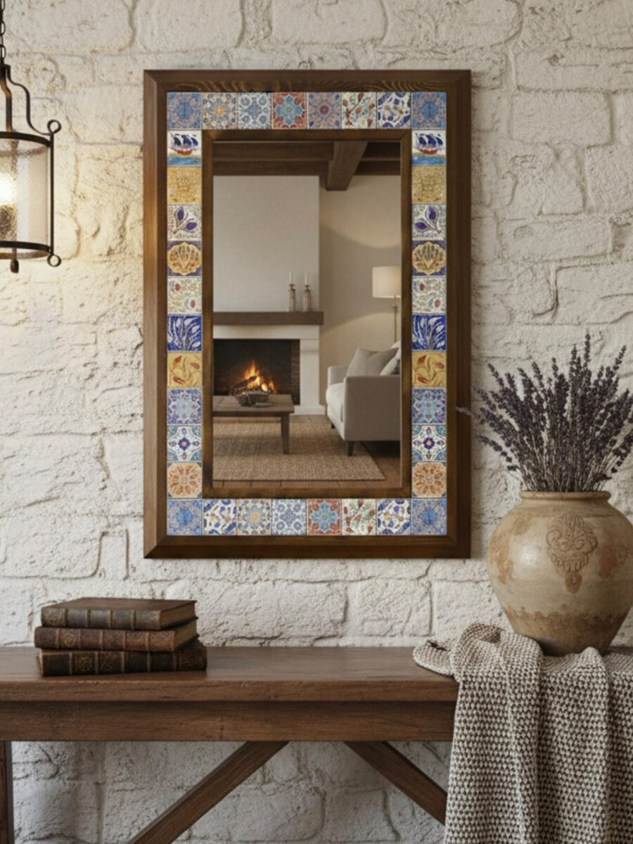 El Yapımı Ahşap Çerçeveli Etnik Desenli Çini Karolu Ayna