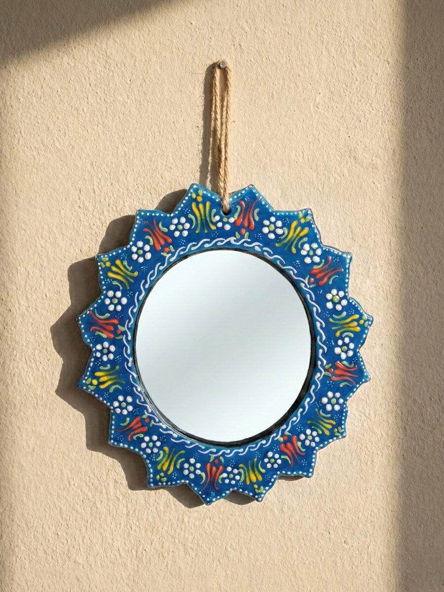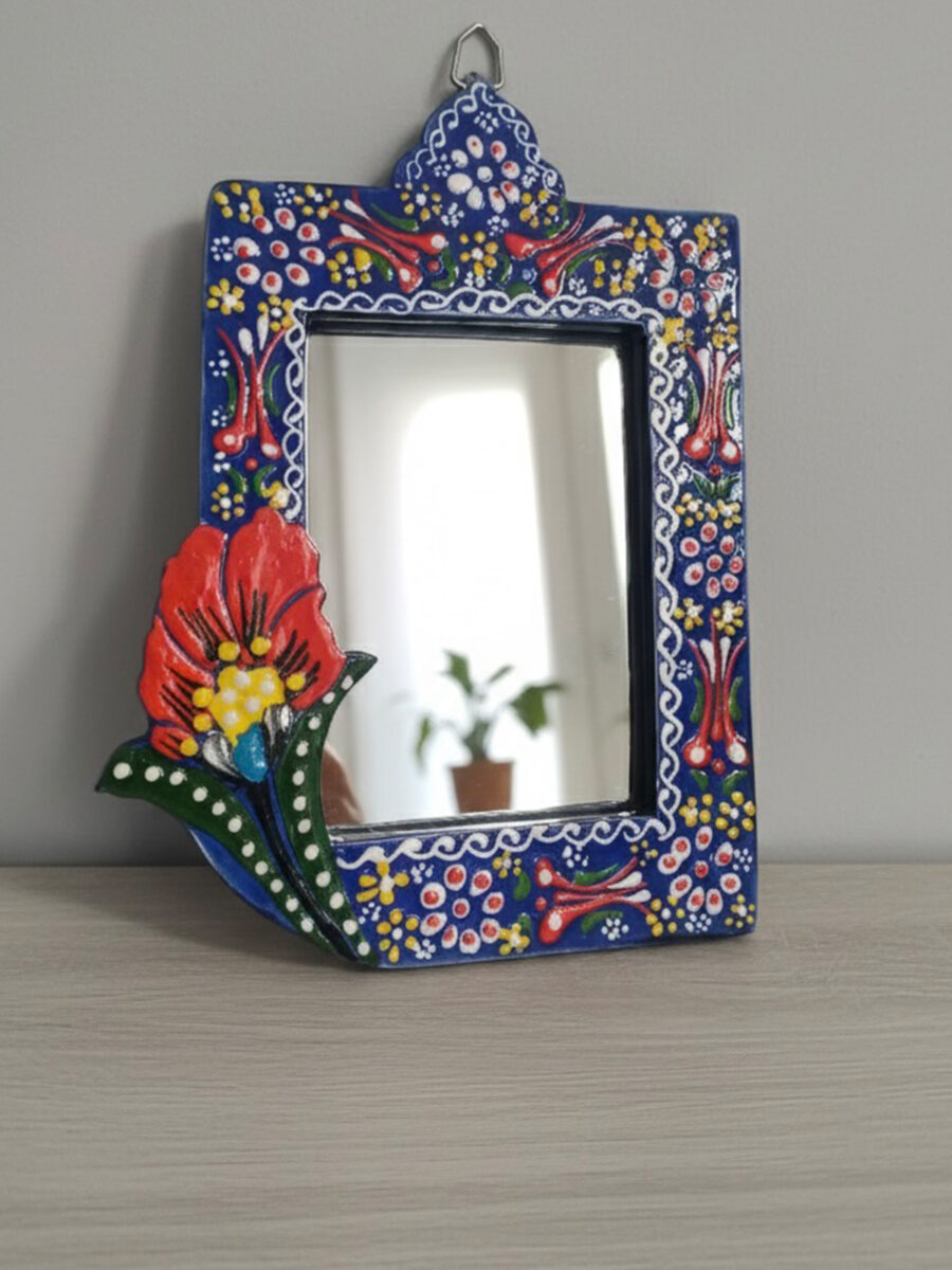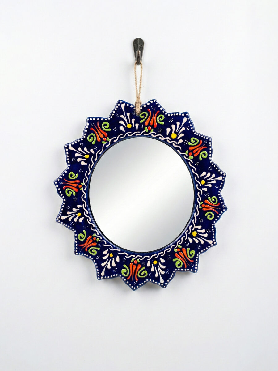 Evinizin en sade duvarını, geleneksel motiflerin ışıltısıyla bir sanat köşesine dönüştürün. El işçiliğiyle bezenmiş kabartma detayları ve solmayan canlı renkleriyle bu seramik çini ayna; antre, banyo veya salonunuza hem otantik bir şıklık hem de ferah bir derinlik katmak için tasarlandı.