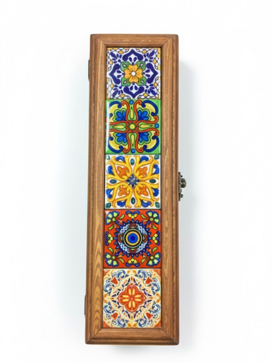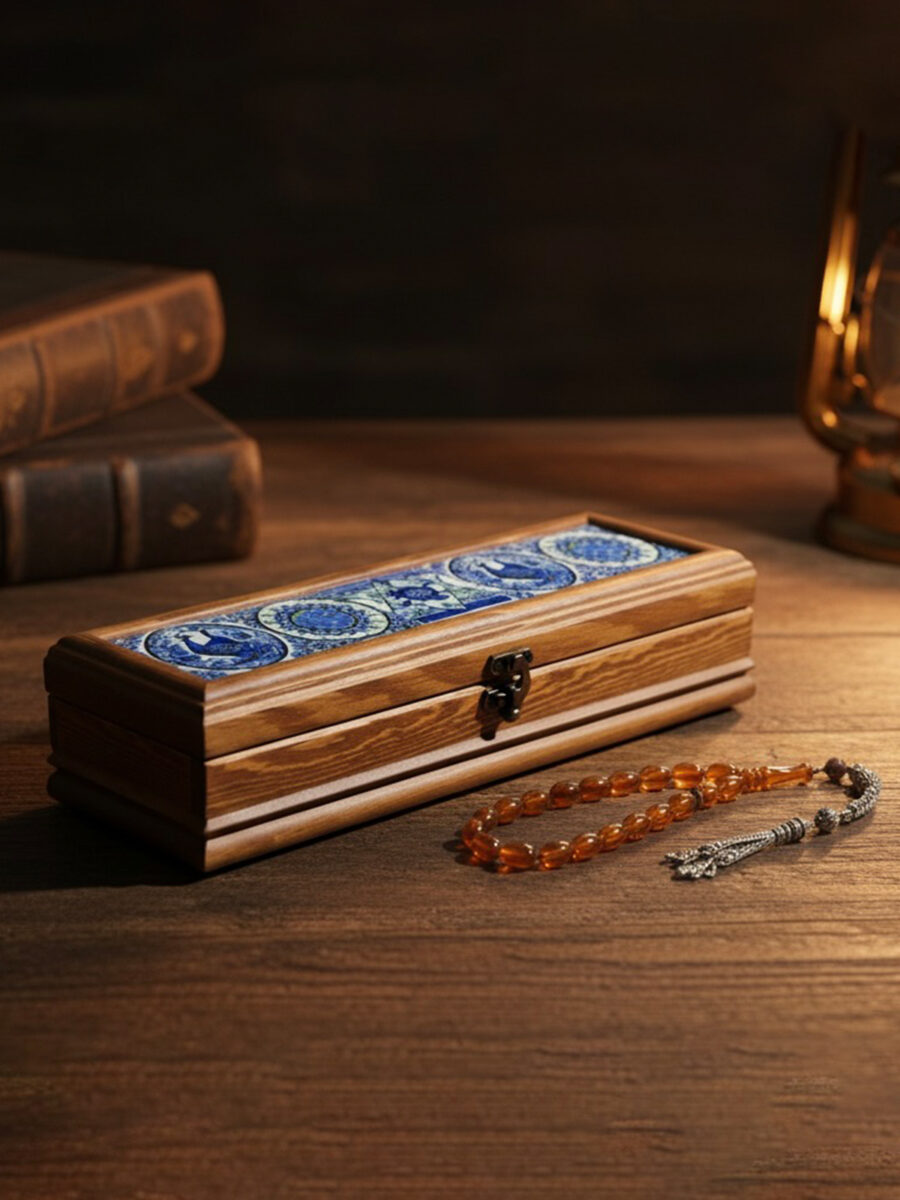 El Yapımı Çini Karo Baskılı Ahşap Tespih Kutusu (5x15cm)