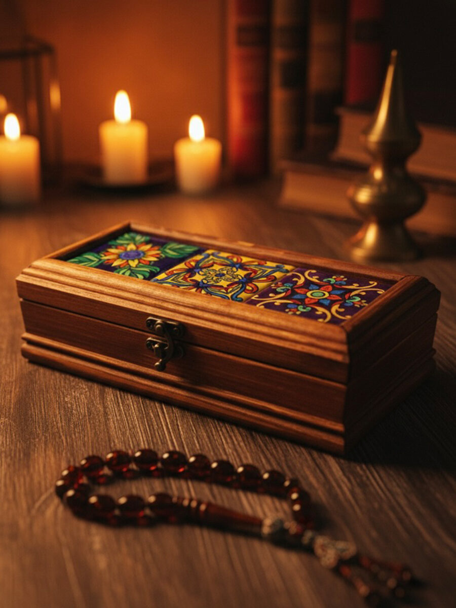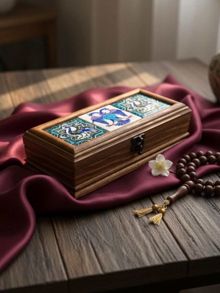 Manevi değerlerinizi ve özel aksesuarlarınızı hak ettiği özenle koruyun. Bu kutu, klasik Osmanlı çini motiflerini doğal ahşabın sıcaklığıyla buluşturarak her mekana estetik katıyor. Kutunun kapağında, beyaz ve mavi tonlarının hakim olduğu, el işçiliği çini panel bulunuyor . Bu desende, tavus kuşu ve geometrik desenlerin zarif birlikteliği geleneksel İznik/Kütahya çini sanatının en güzel örneklerini yansıtıyor.