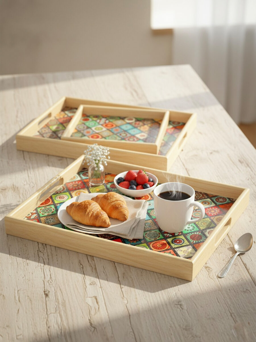 Ahşabın sıcak dokusunu desenleriyle buluşturan bu 3 farklı boydaki tasarım tepsi seti; çay ve kahve saatlerinize sanatsal bir dokunuş katarken, göz alıcı detaylarıyla hem misafirlerinizi etkileyecek şık bir sunumluk hem de sevdikleriniz için zarafet dolu, unutulmaz bir hediye seçeneğidir.