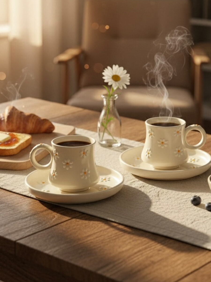 El Yapımı Papatya Desenli 2 Kişilik 4 Parça Seramik Fincan Takımı