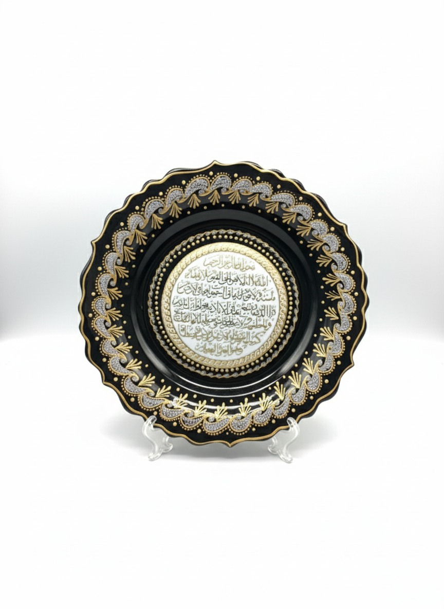 El İşi Gümüş ve Altın Desenli Ayetel Kürsi Yazılı 30 cm Çini Tabak