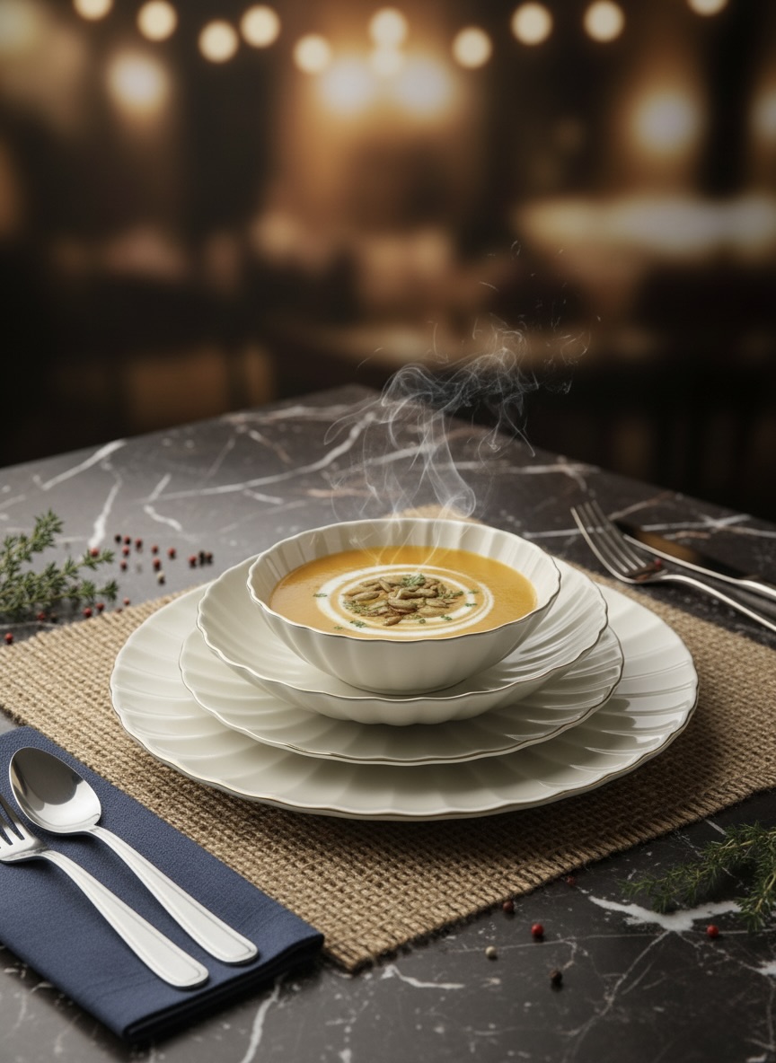 Yemek sunumlarınız için ihtiyacınız olan her şey, altın şıklığıyla tek bir kutuda. Tulu Porselen kalitesiyle üretilen bu 6 kişilik (24 parça) yemek takımı; çorba kasesinden servis tabağına kadar eksiksiz bir set sunar. Porselenin pürüzsüz dokusu ve kenarlarındaki zarif gold şeritler, her öğünü özel bir davete dönüştürmek için tasarlandı.