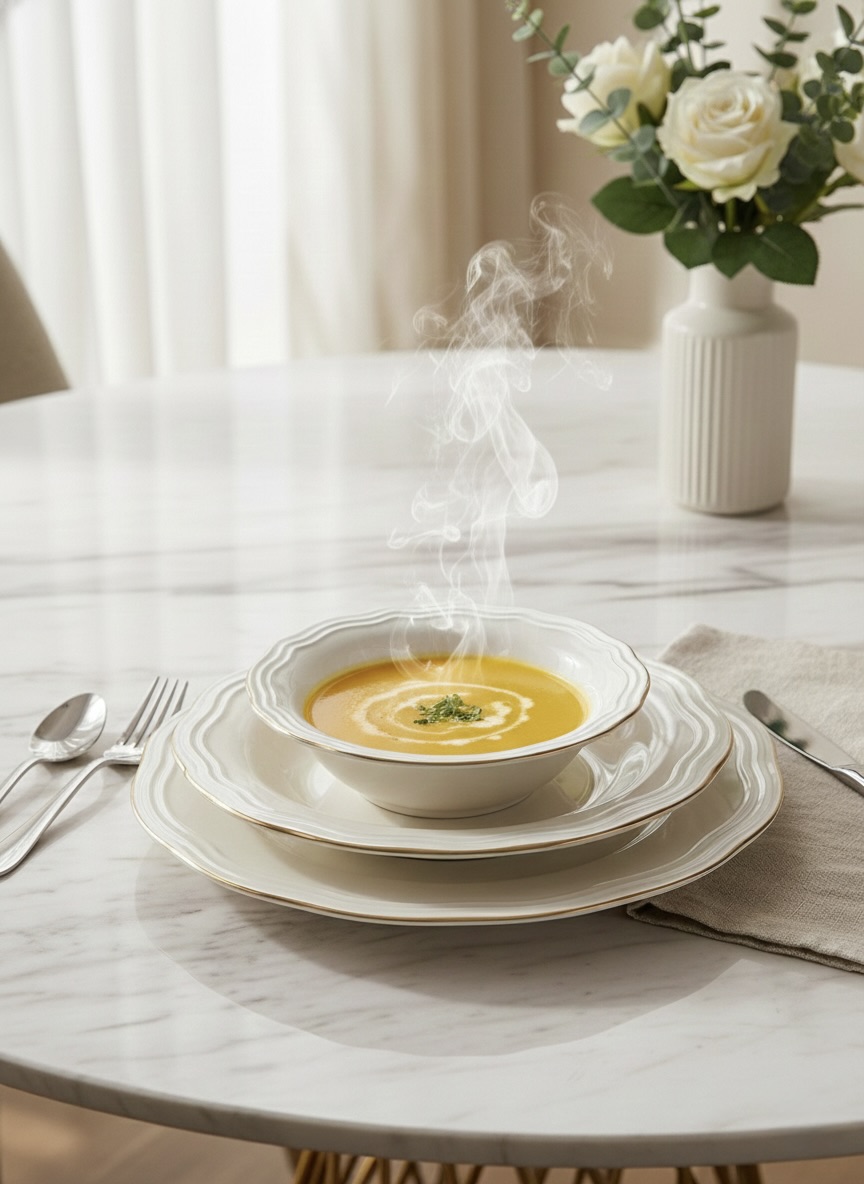Yemek sunumlarınız için ihtiyacınız olan her şey, altın şıklığıyla tek bir kutuda. Tulu Porselen kalitesiyle üretilen bu 6 kişilik (24 parça) yemek takımı; çorba kasesinden servis tabağına kadar eksiksiz bir set sunar. Porselenin pürüzsüz dokusu ve kenarlarındaki zarif gold şeritler, her öğünü özel bir davete dönüştürmek için tasarlandı.