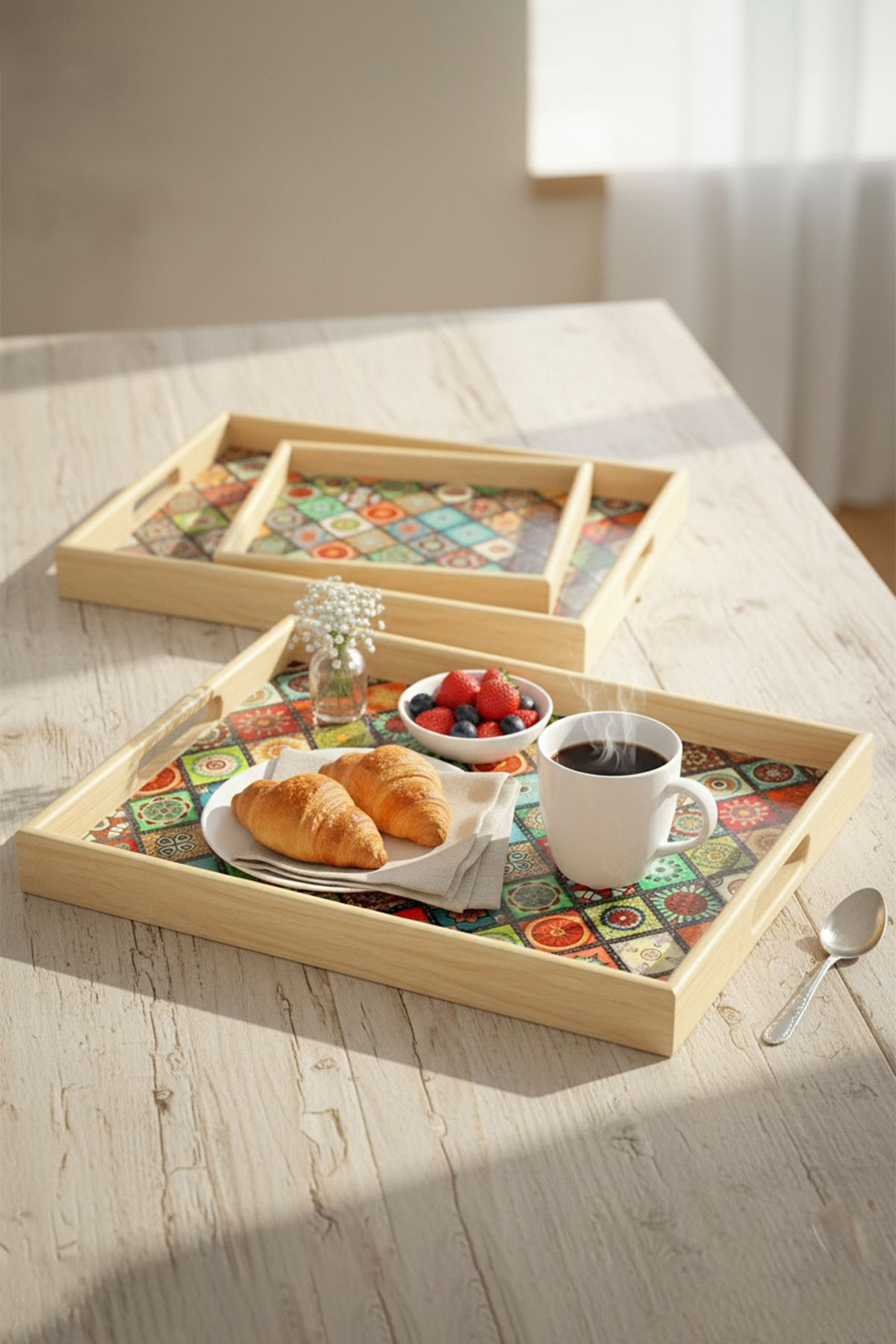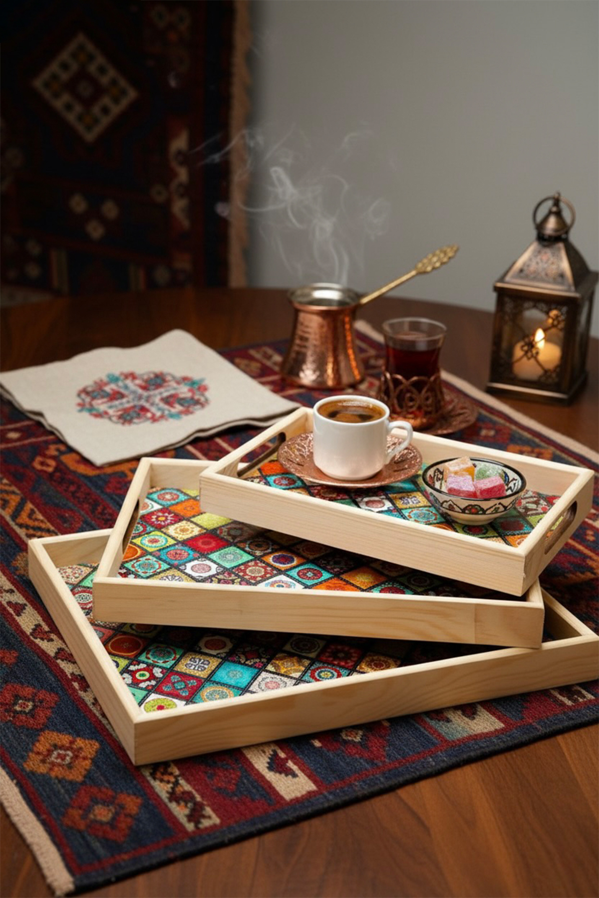Ahşabın sıcak dokusunu desenleriyle buluşturan bu 3 farklı boydaki tasarım tepsi seti; çay ve kahve saatlerinize sanatsal bir dokunuş katarken, göz alıcı detaylarıyla hem misafirlerinizi etkileyecek şık bir sunumluk hem de sevdikleriniz için zarafet dolu, unutulmaz bir hediye seçeneğidir.