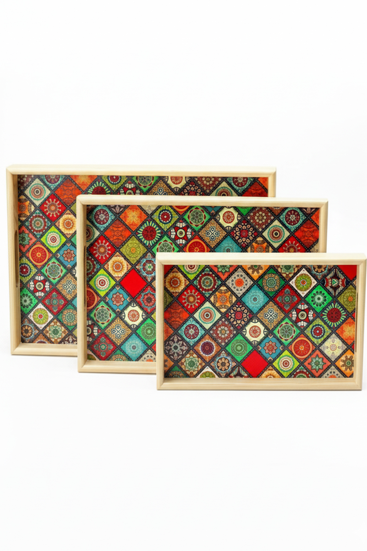 Ahşap 3’lü Set Mozaik Desenli Dekoratif Sunum Tepsisi