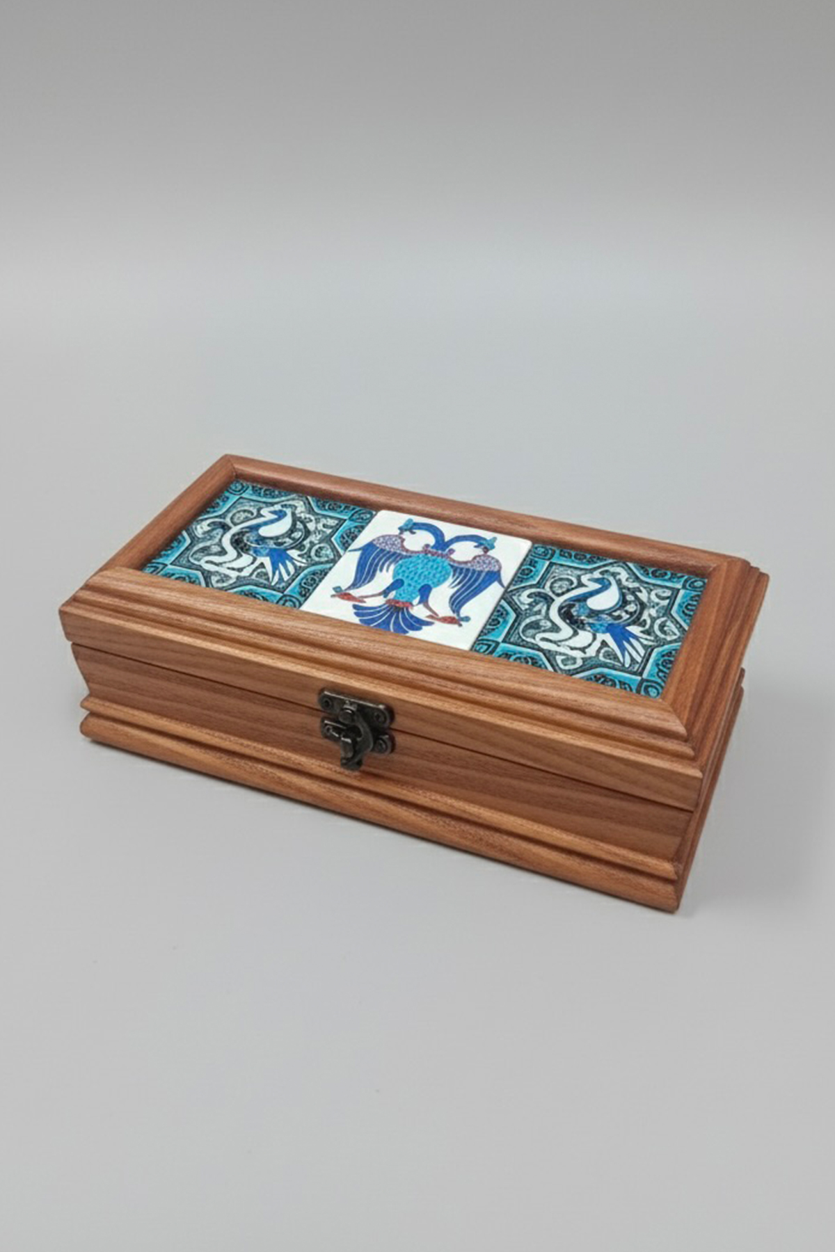 Manevi değerlerinizi ve özel aksesuarlarınızı hak ettiği özenle koruyun. Bu kutu, klasik Osmanlı çini motiflerini doğal ahşabın sıcaklığıyla buluşturarak her mekana estetik katıyor. Kutunun kapağında, beyaz ve mavi tonlarının hakim olduğu, el işçiliği çini panel bulunuyor . Bu desende, tavus kuşu ve geometrik desenlerin zarif birlikteliği geleneksel İznik/Kütahya çini sanatının en güzel örneklerini yansıtıyor.