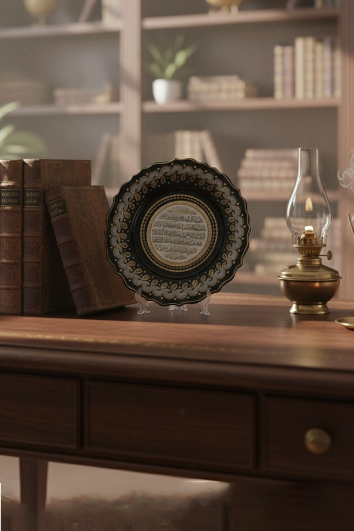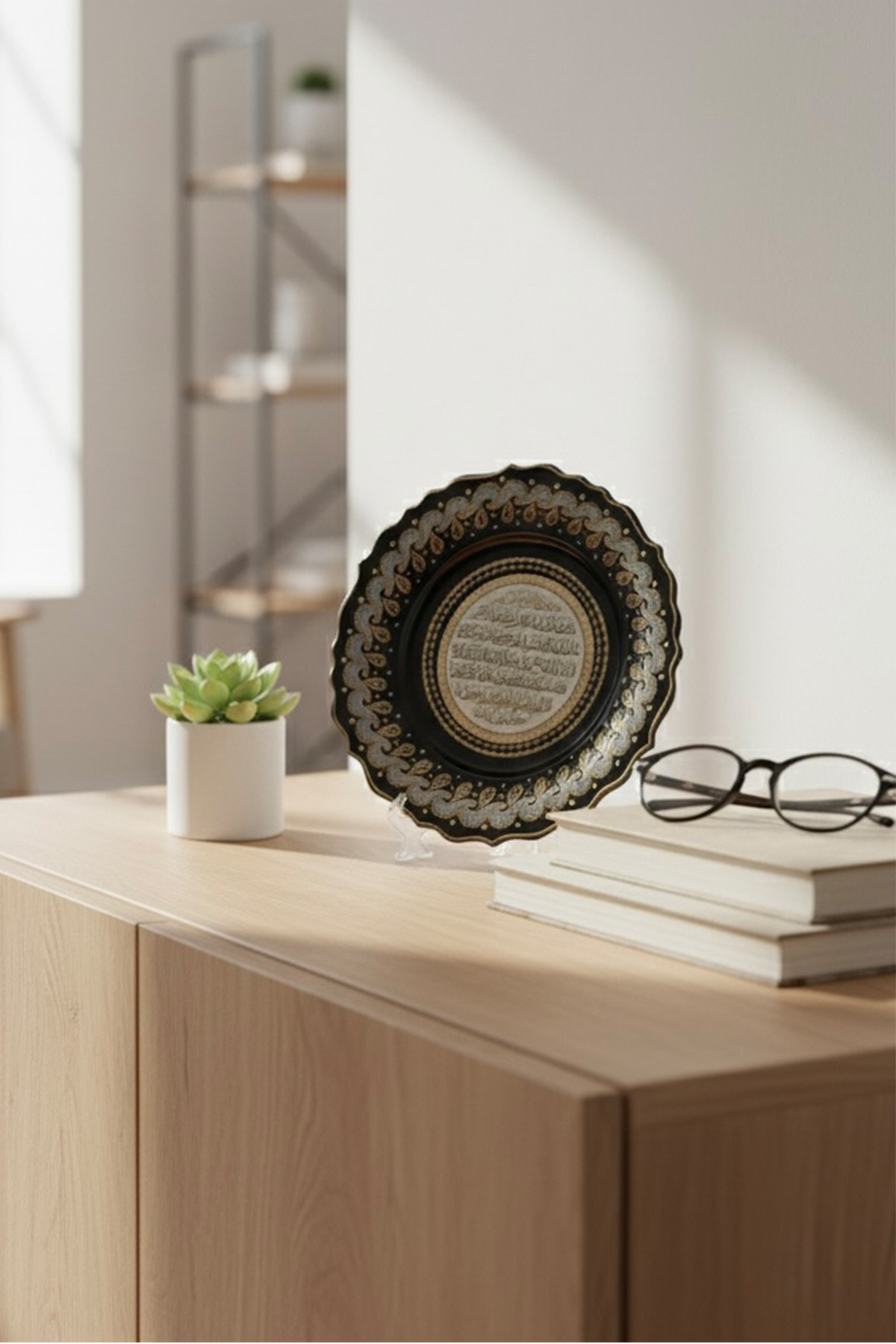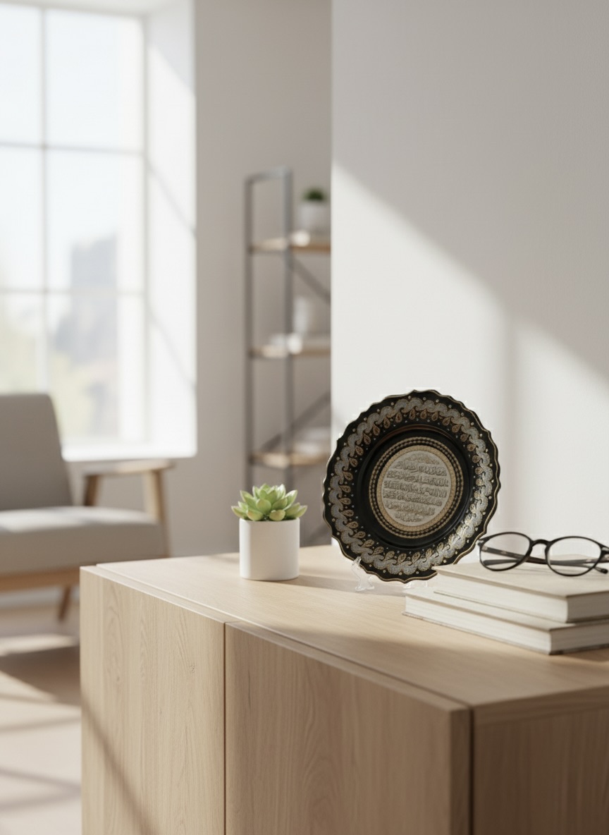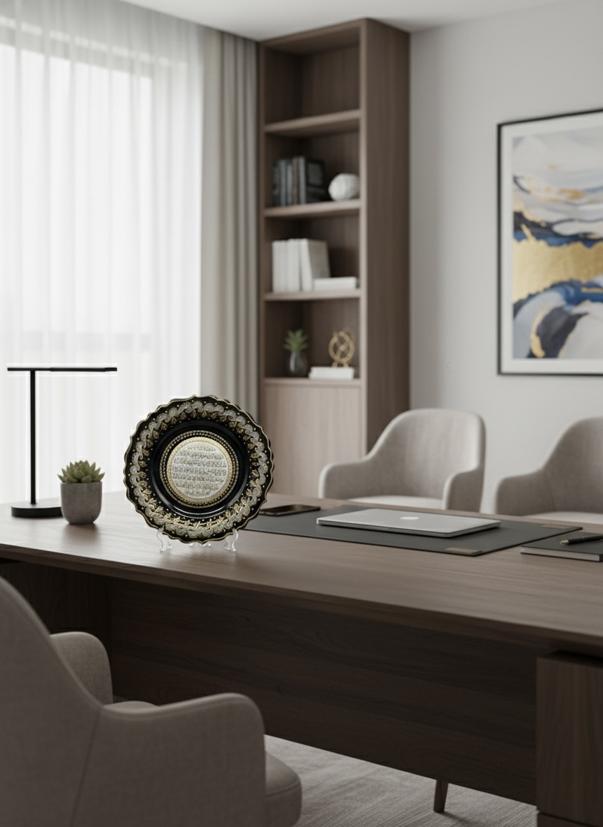 El İşi Gümüş ve Altın Desenli Ayetel Kürsi Yazılı 30 cm Çini Tabak