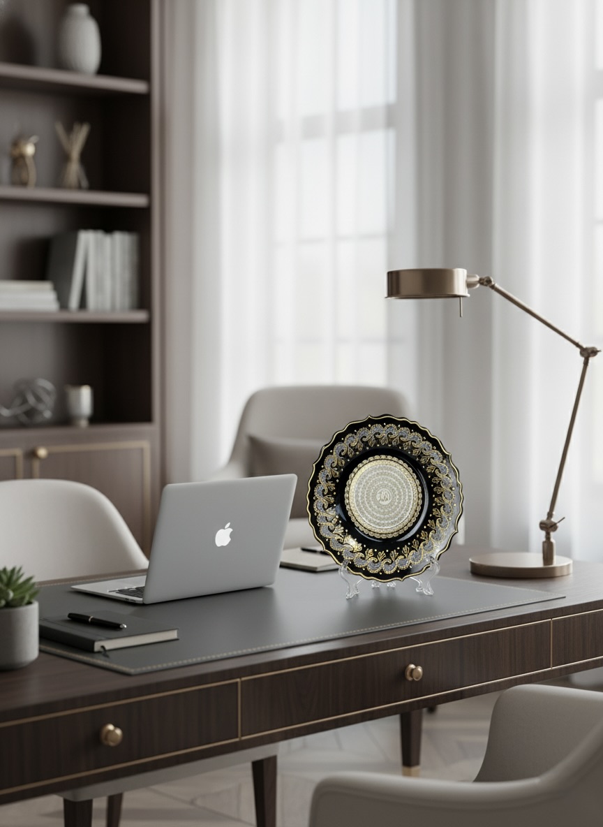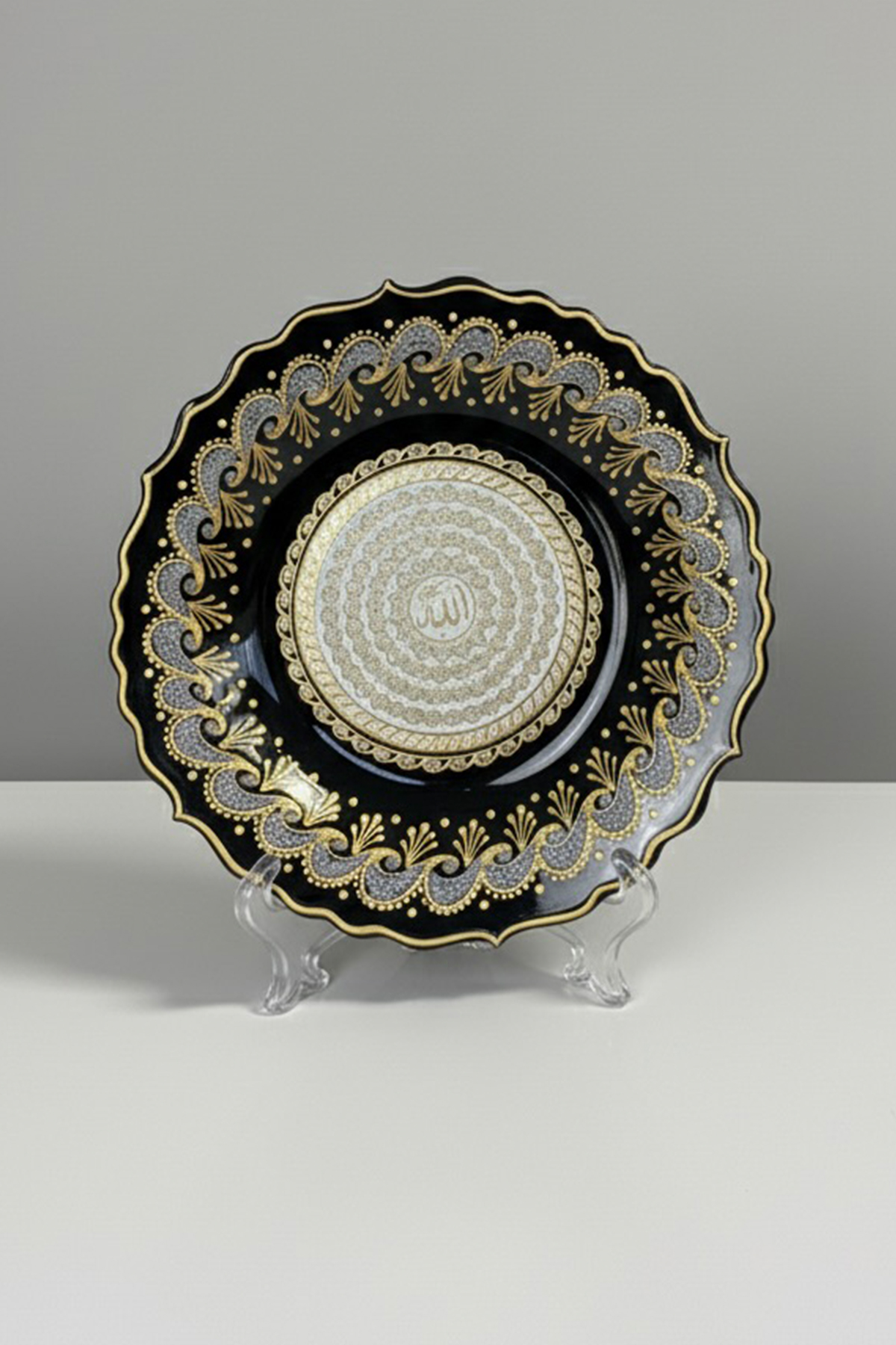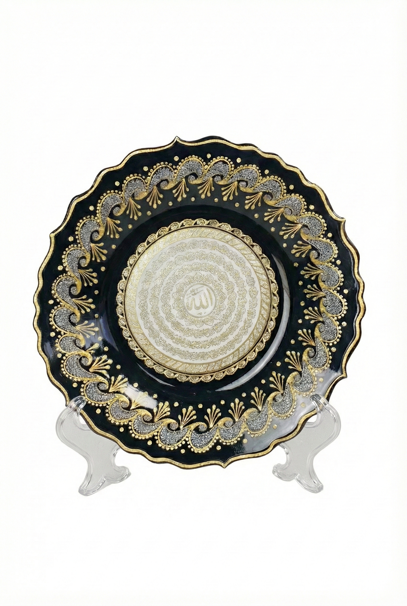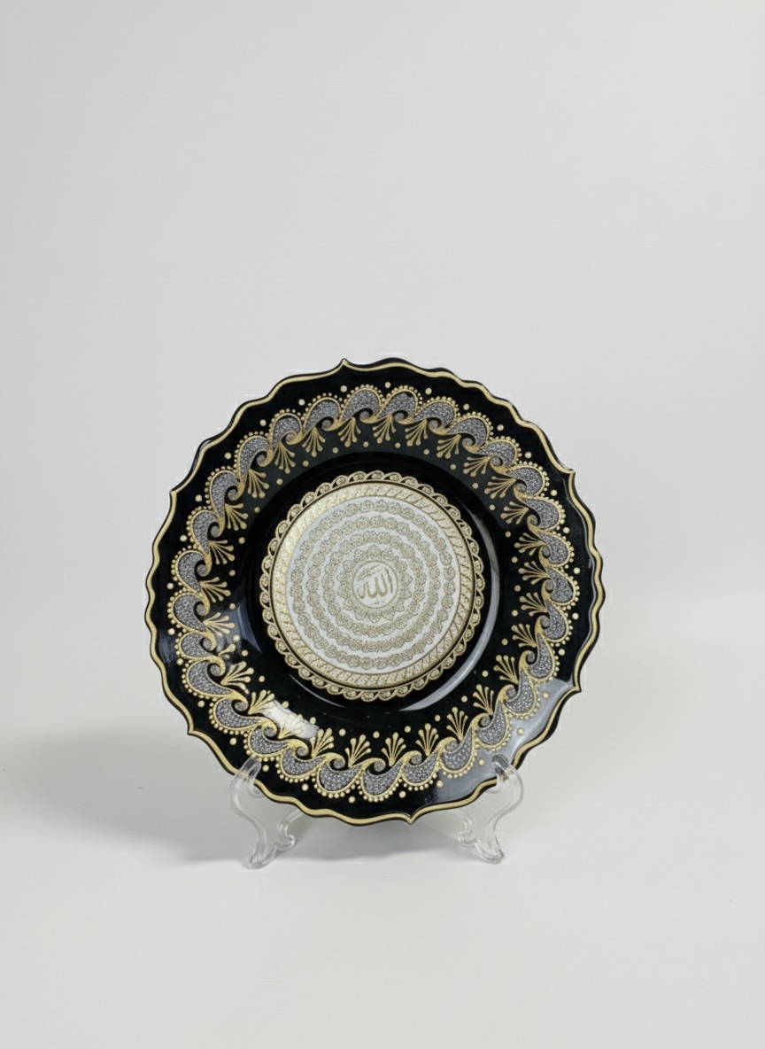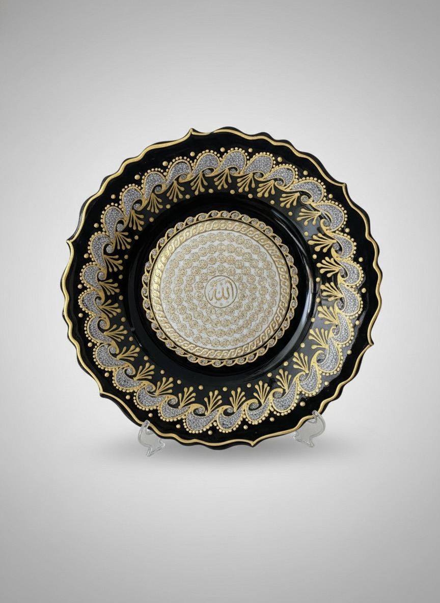 El İşi Gümüş ve Altın Desenli Esma-ül Hüsna Yazılı 30 cm Çini Tabak