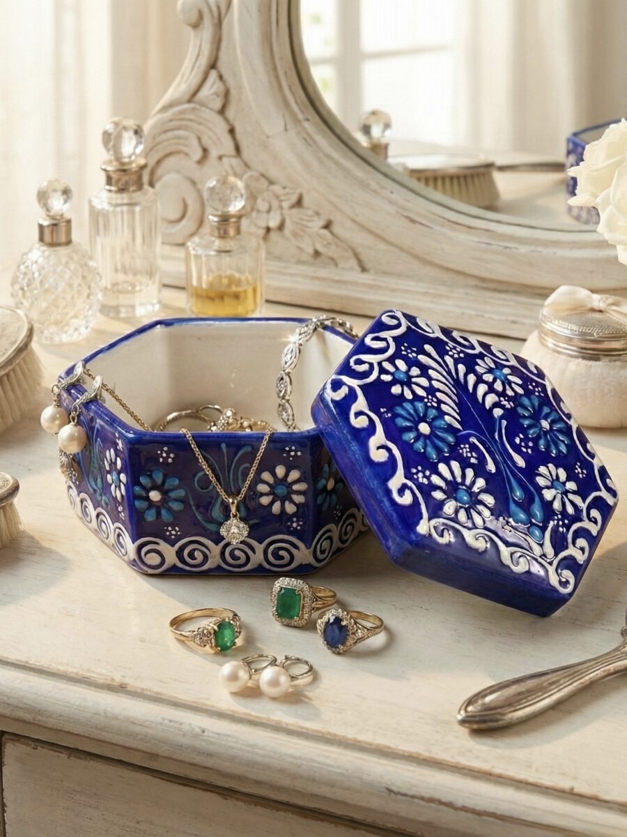El Yapımı Dekoratif Çini Altıgen Mücevher Kutusu