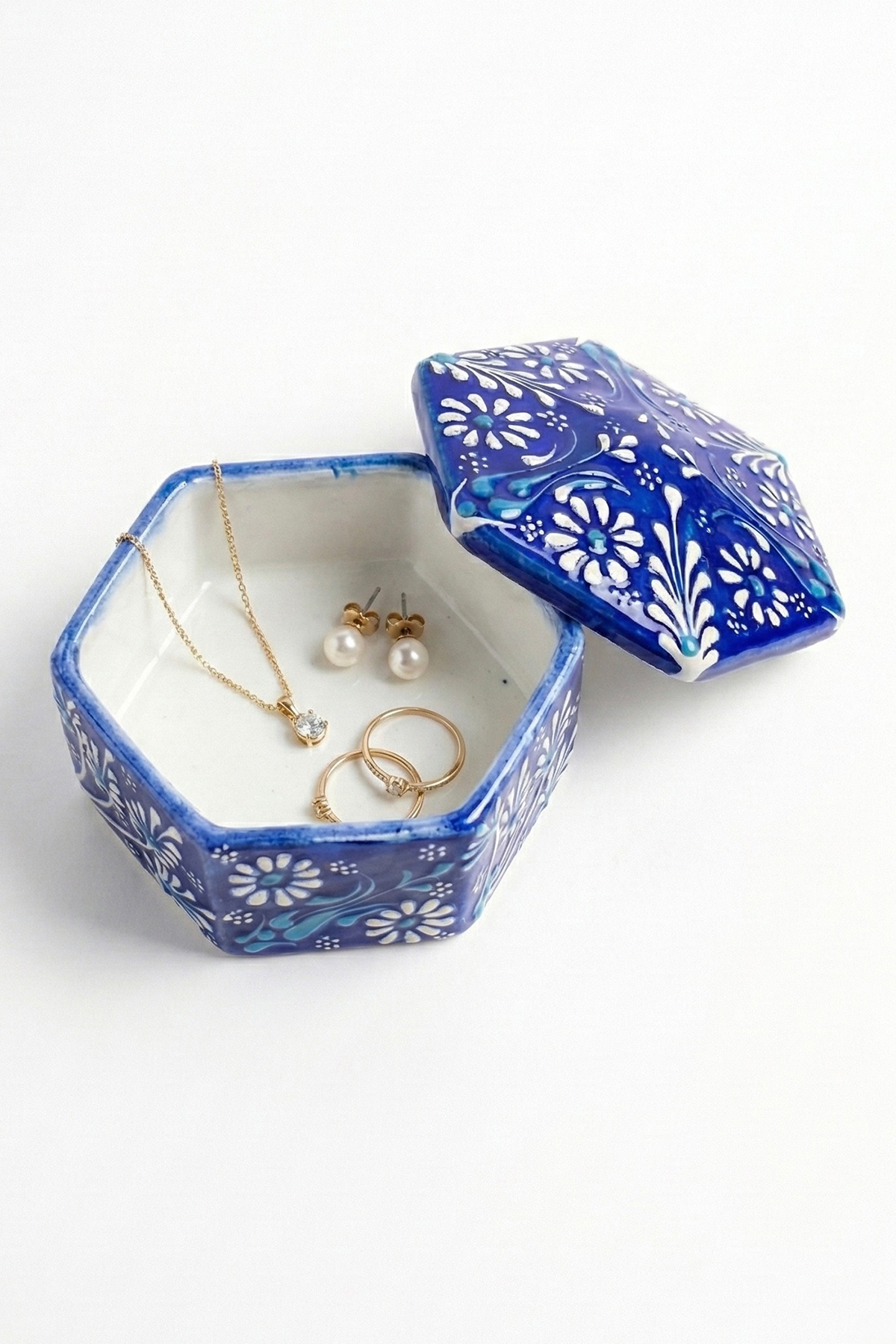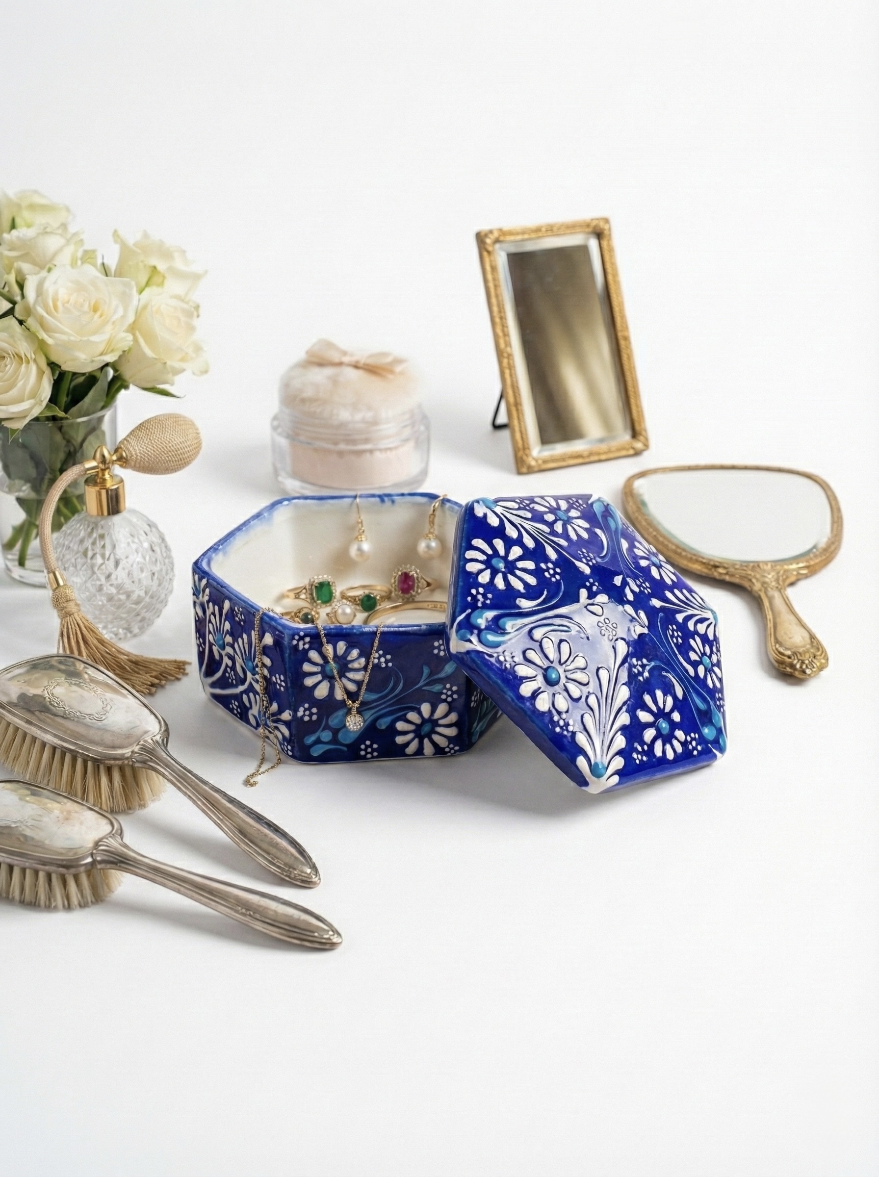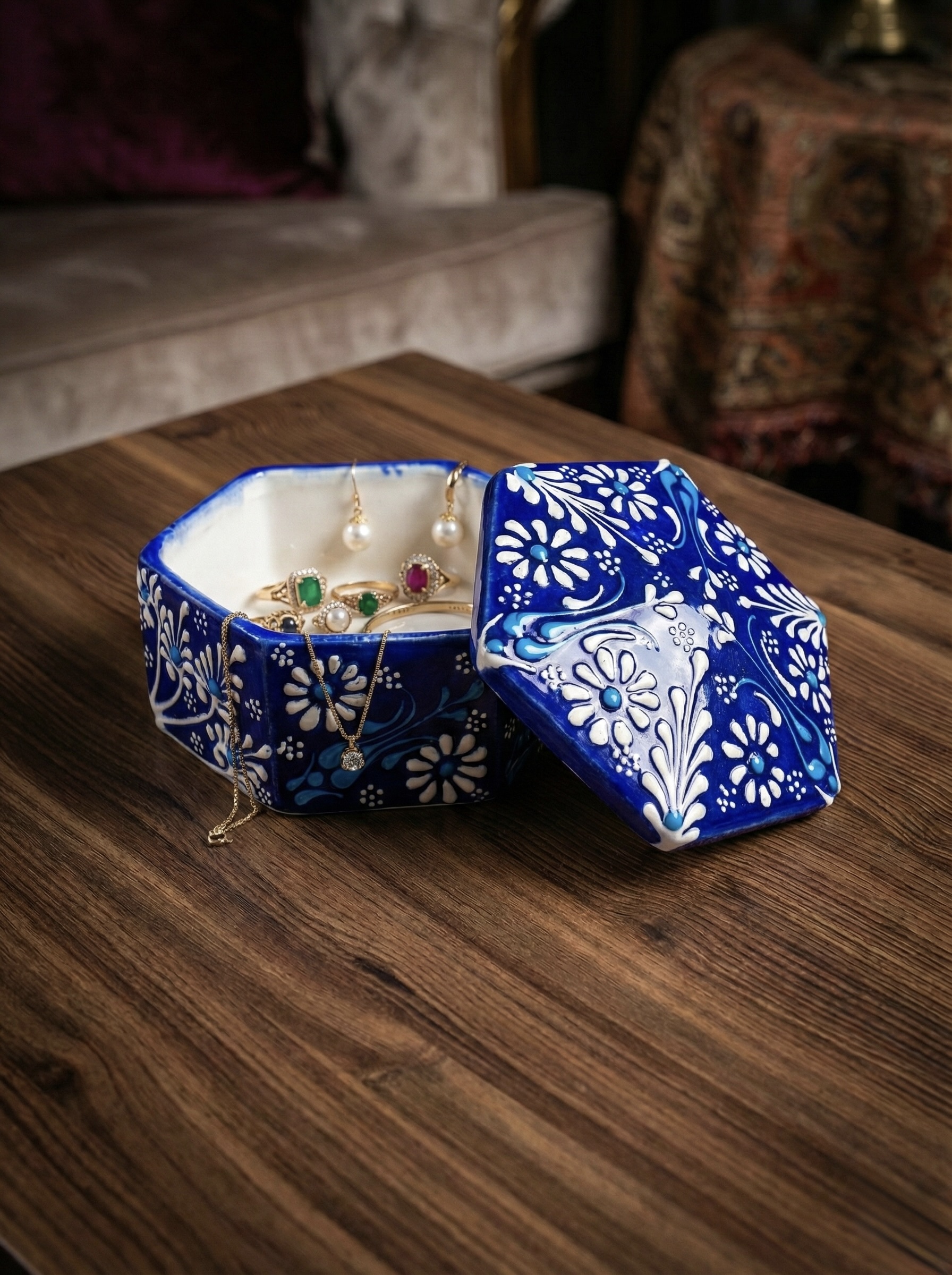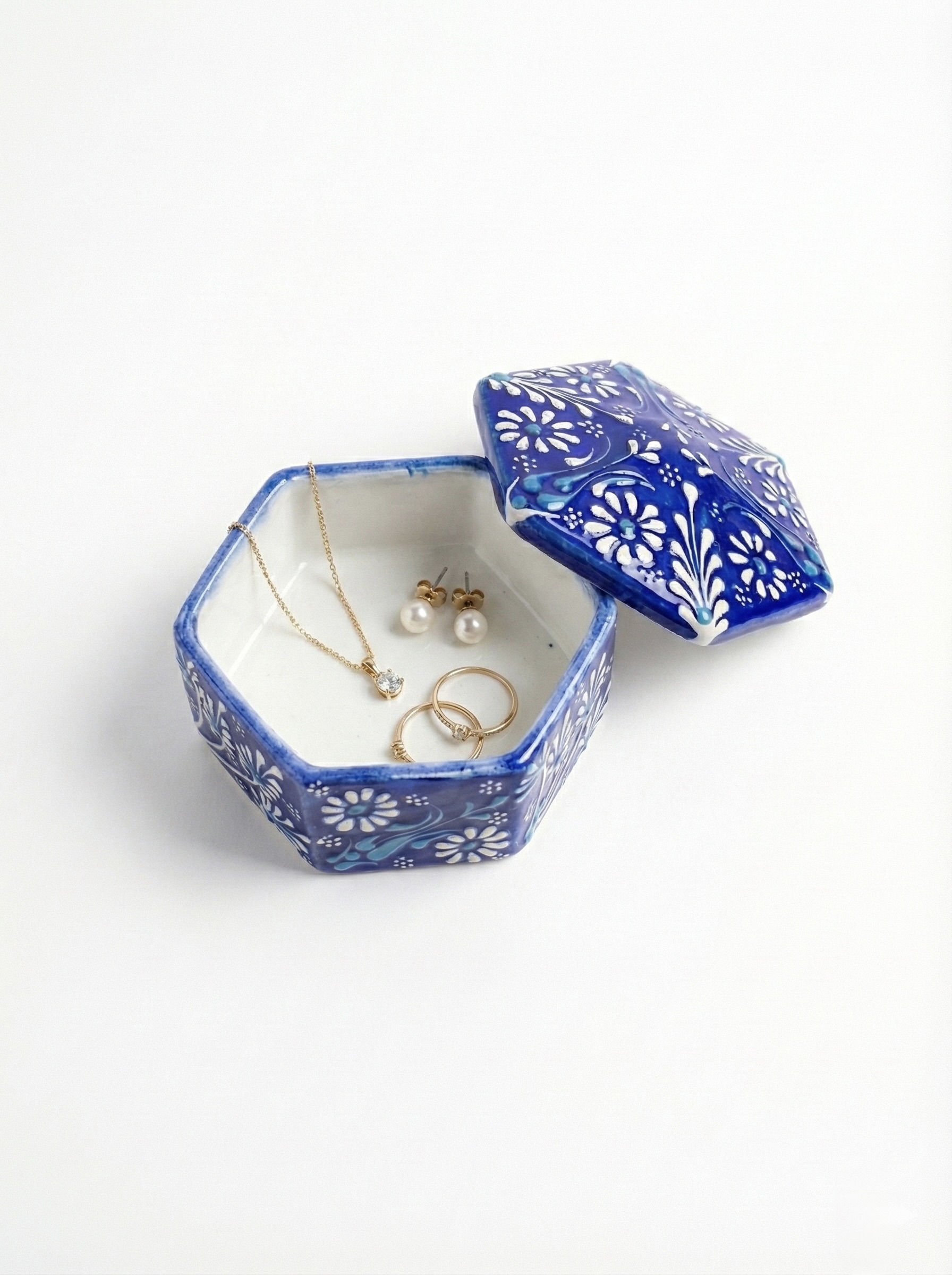 El Yapımı Dekoratif Çini Altıgen Mücevher Kutusu
