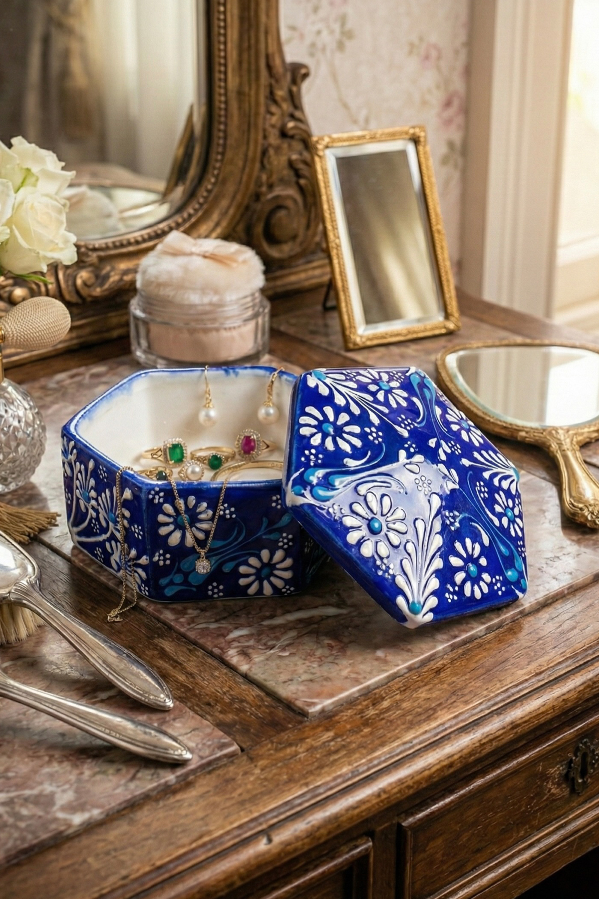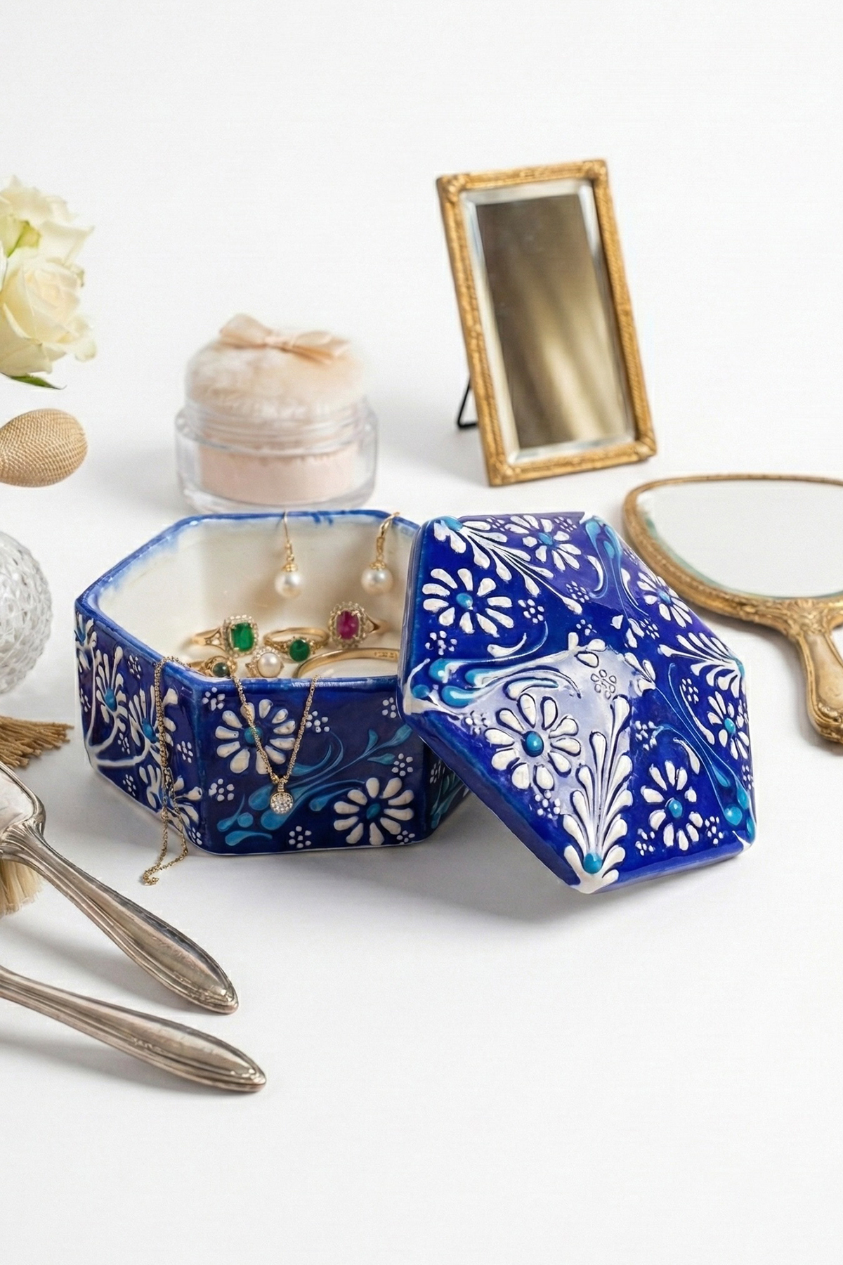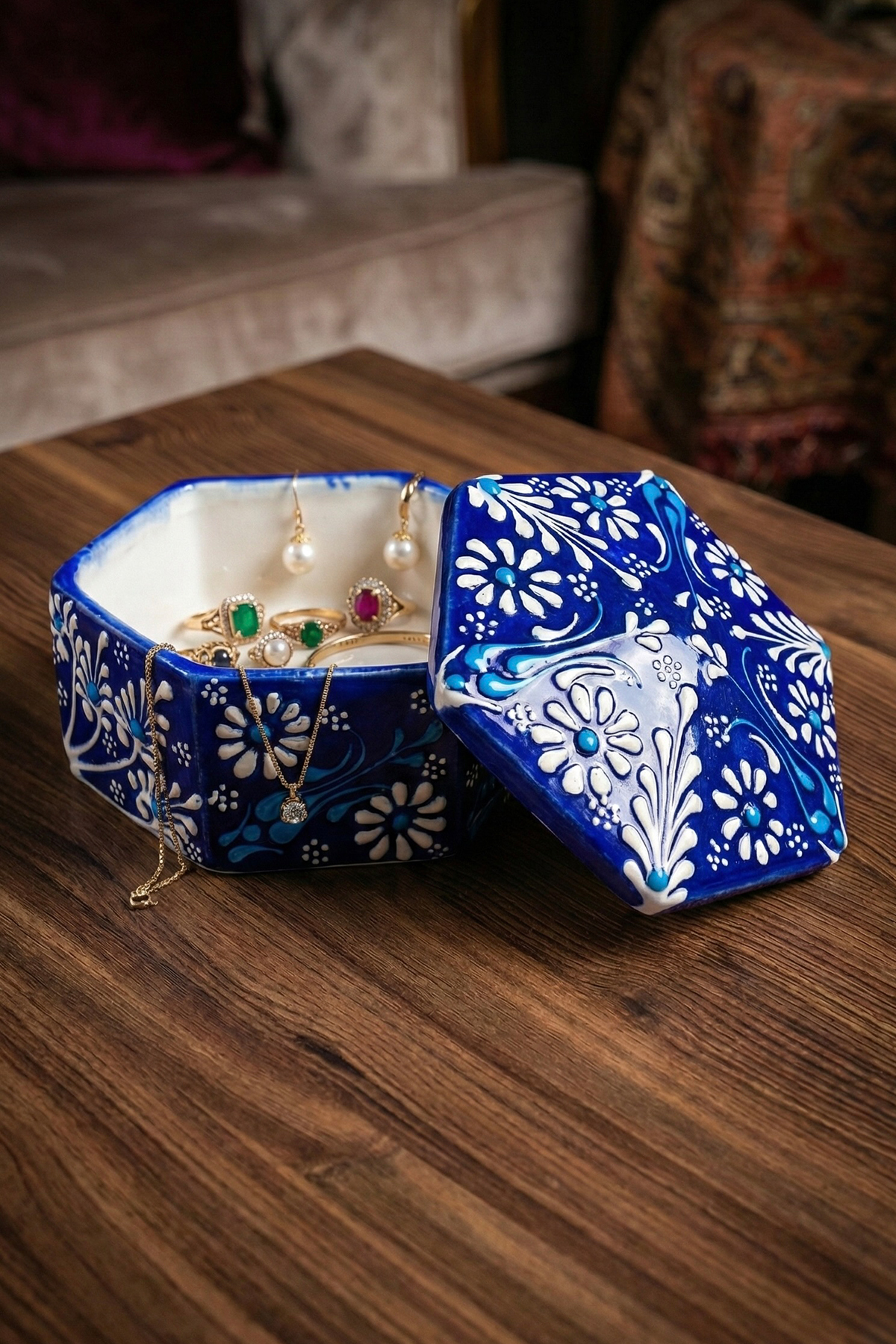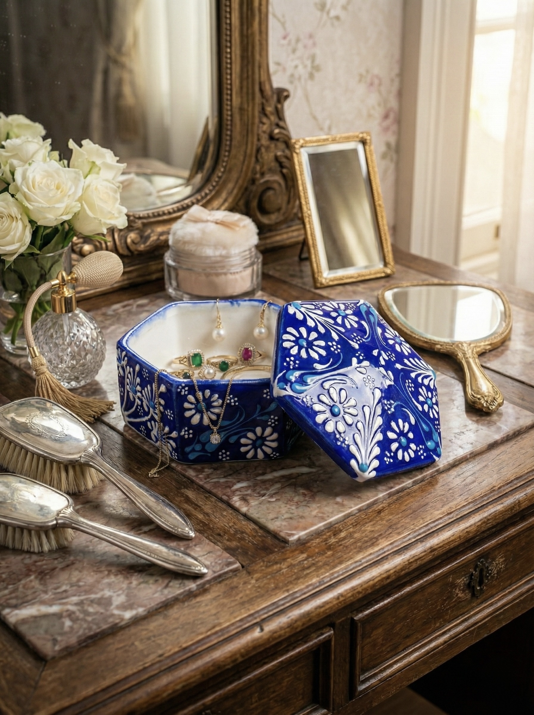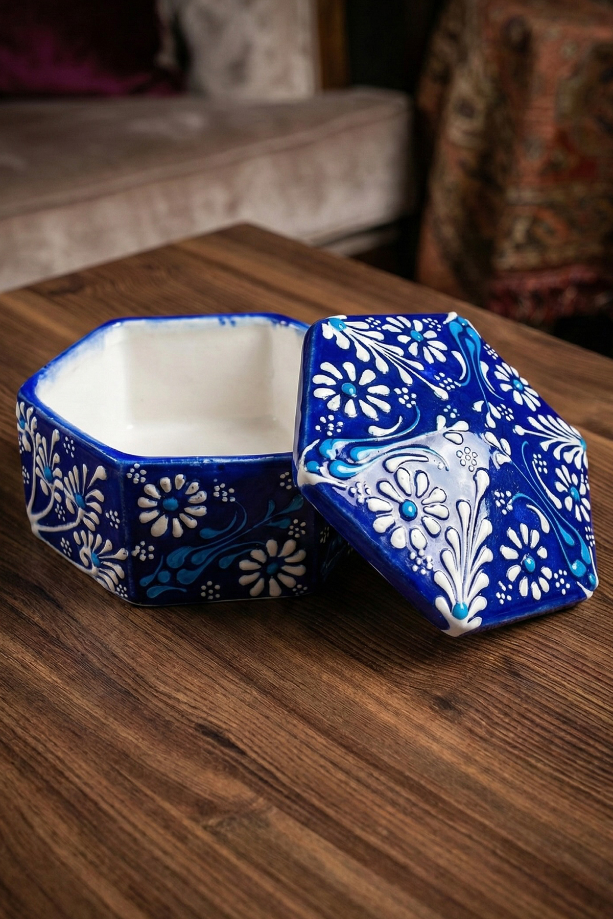 El Yapımı Dekoratif Çini Altıgen Mücevher Kutusu