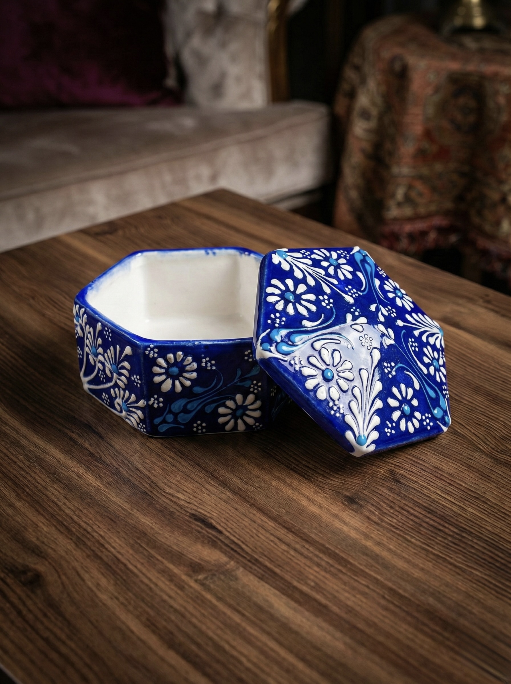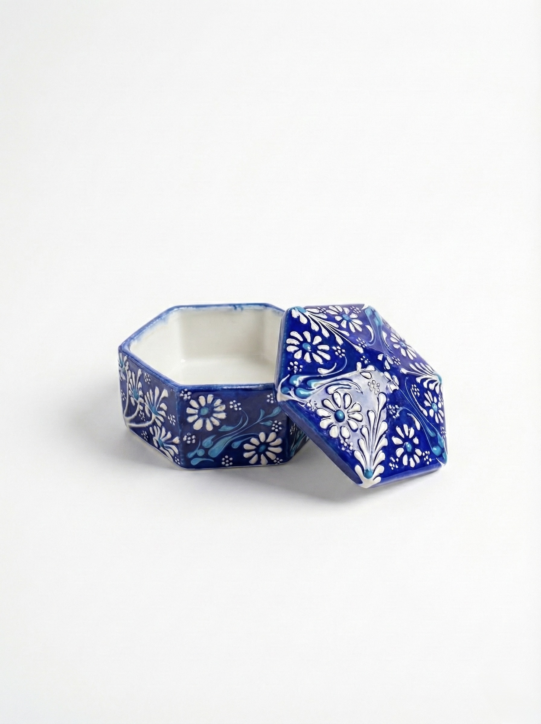 Geleneksel Türk çini sanatının en zarif örneği olan bu altıgen, kapaklı seramik kutu; yüzük, küpe gibi değerli takılarınızı saklamak veya sevdiklerinize minik ama anlamlı bir hediye sunmak için el işçiliğiyle hazırlandı.