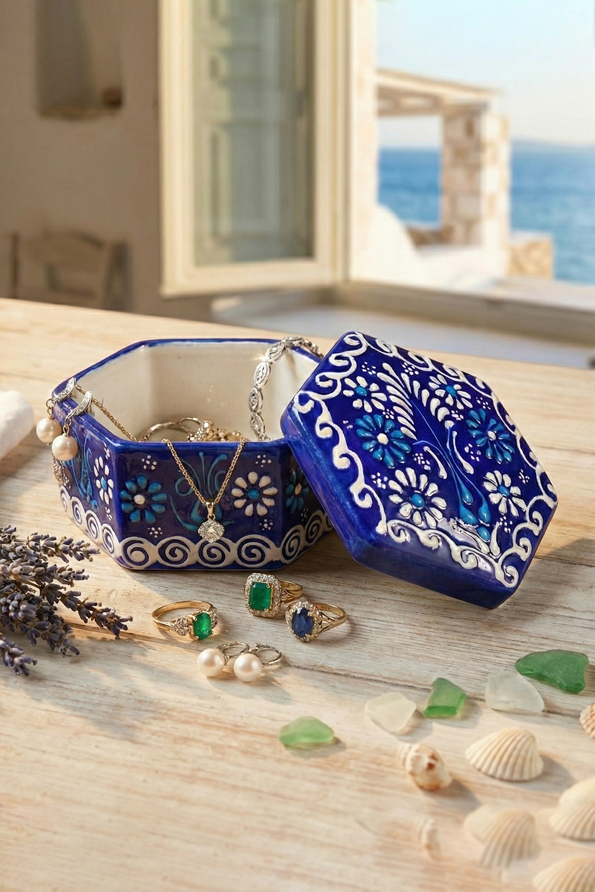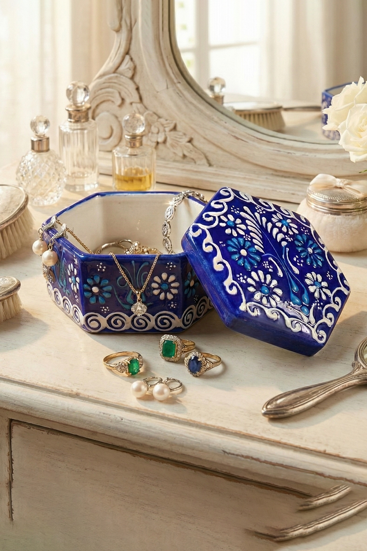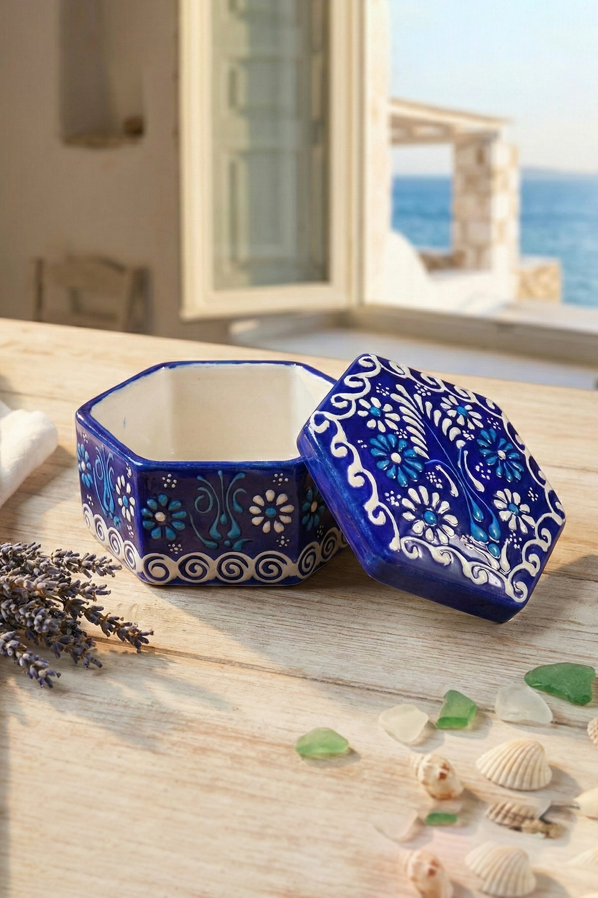 Geleneksel Türk çini sanatının en zarif örneği olan bu altıgen, kapaklı seramik kutu; yüzük, küpe gibi değerli takılarınızı saklamak veya sevdiklerinize minik ama anlamlı bir hediye sunmak için el işçiliğiyle hazırlandı.