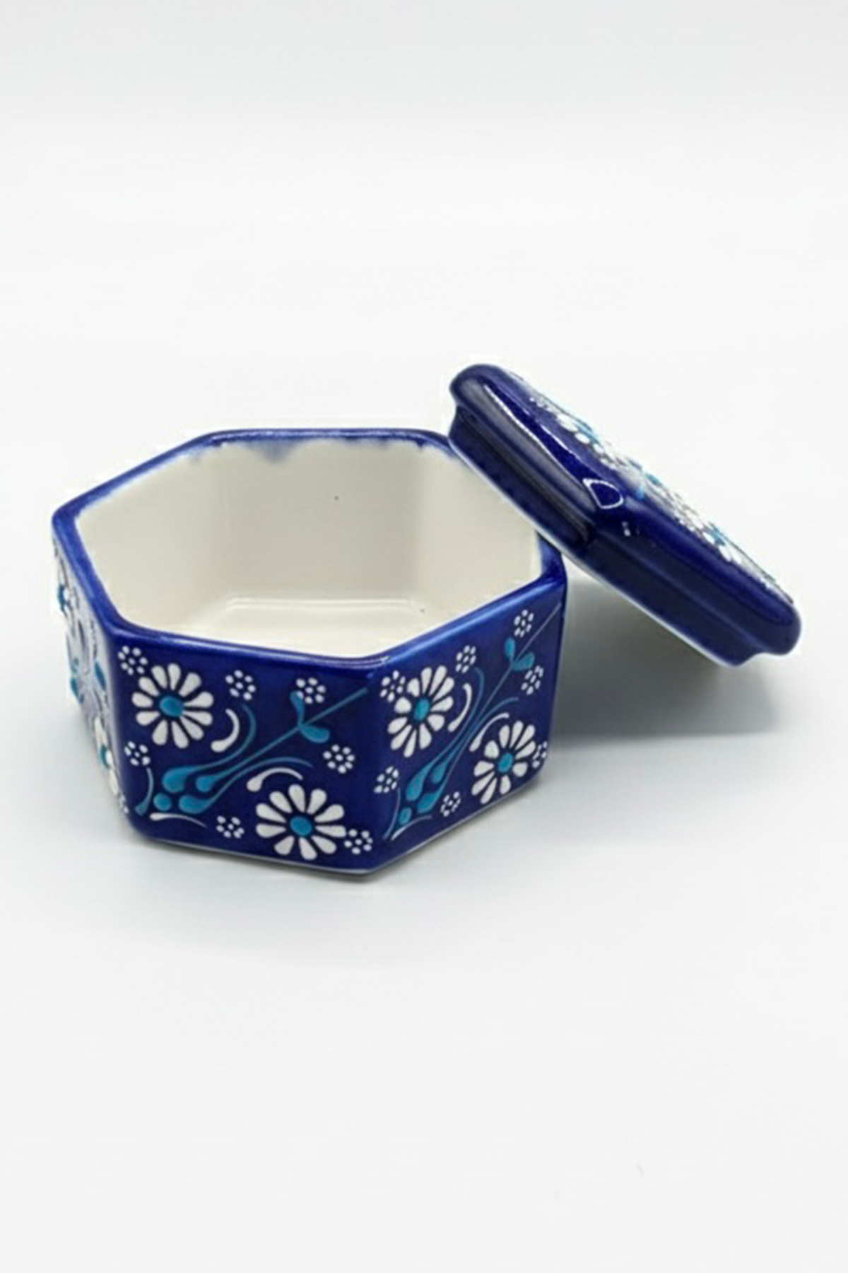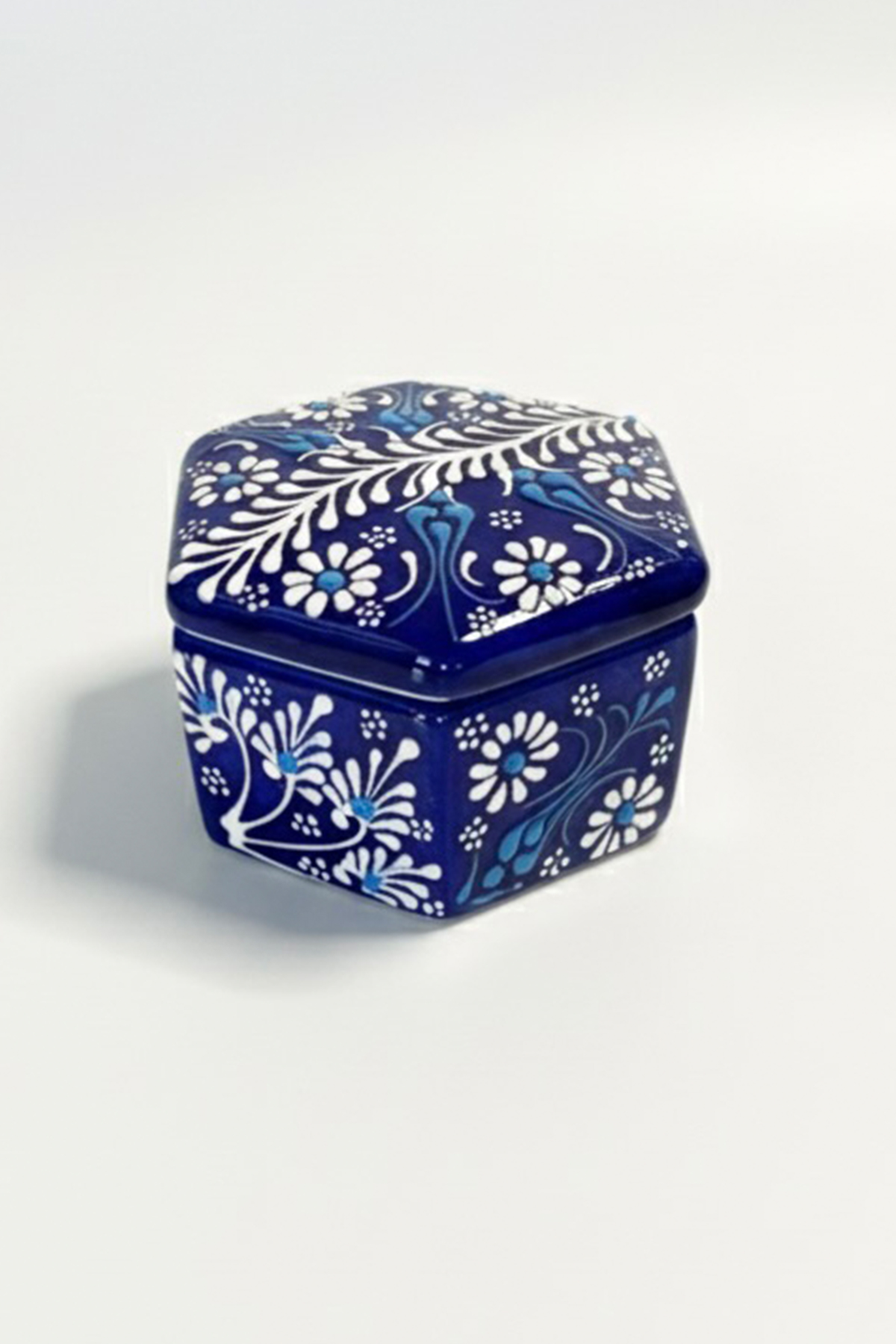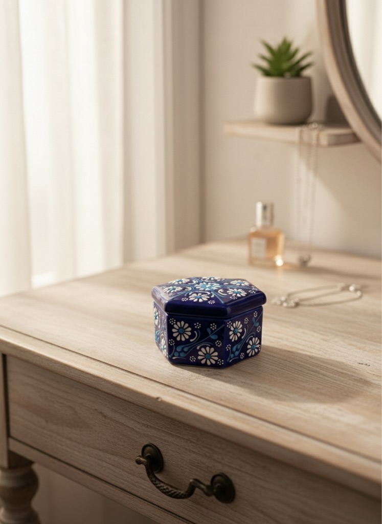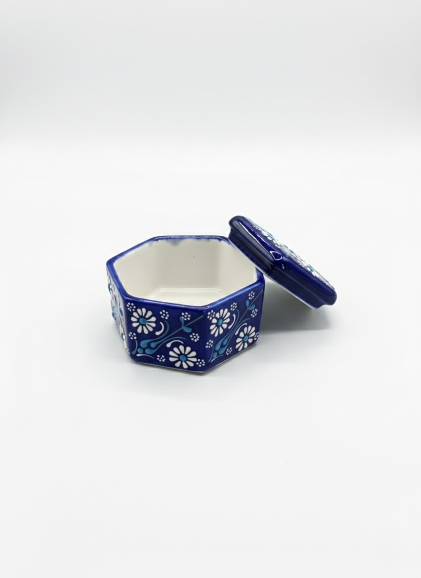 Geleneksel Türk çini sanatının en zarif örneği olan bu altıgen, kapaklı seramik kutu; yüzük, küpe gibi değerli takılarınızı saklamak veya sevdiklerinize minik ama anlamlı bir hediye sunmak için el işçiliğiyle hazırlandı.