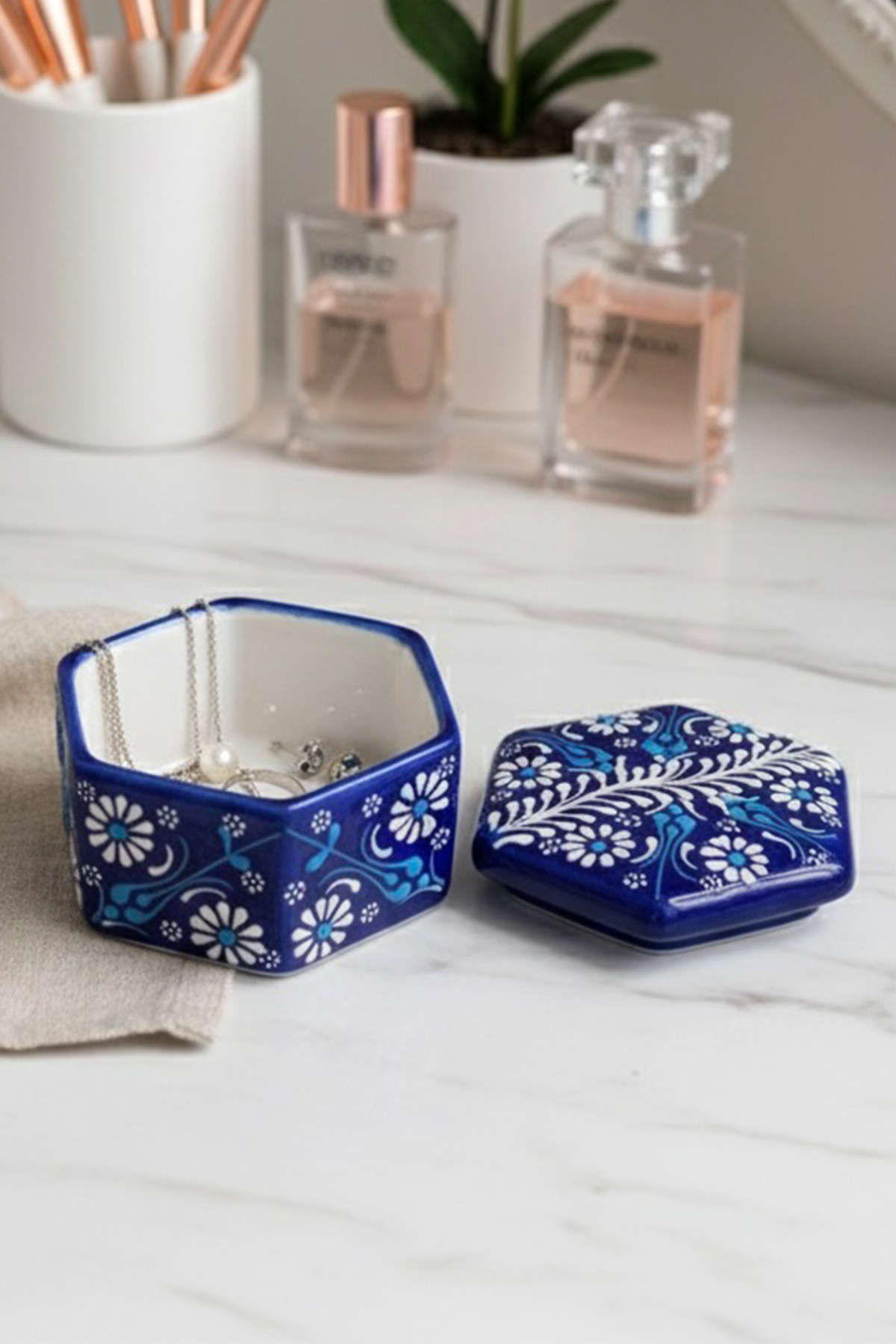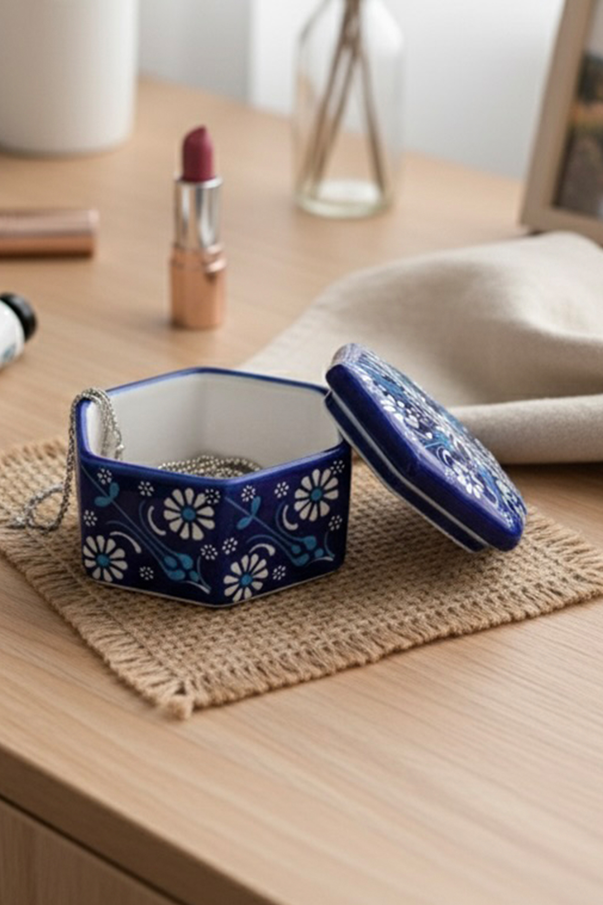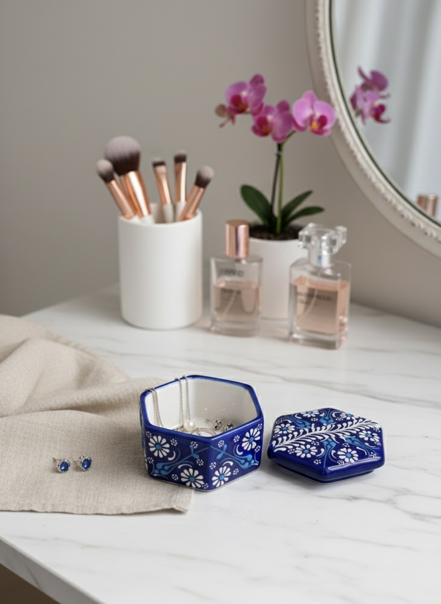 El Yapımı Dekoratif Çini Altıgen Mücevher Kutusu