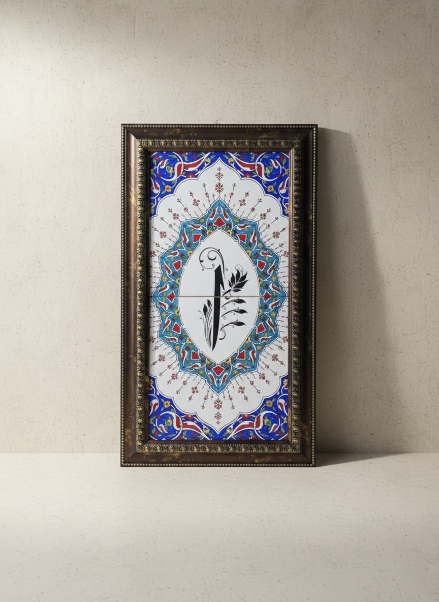 El Yapımı Gold İşlemeli Elif Harfi Yazılı Çini Tablo
