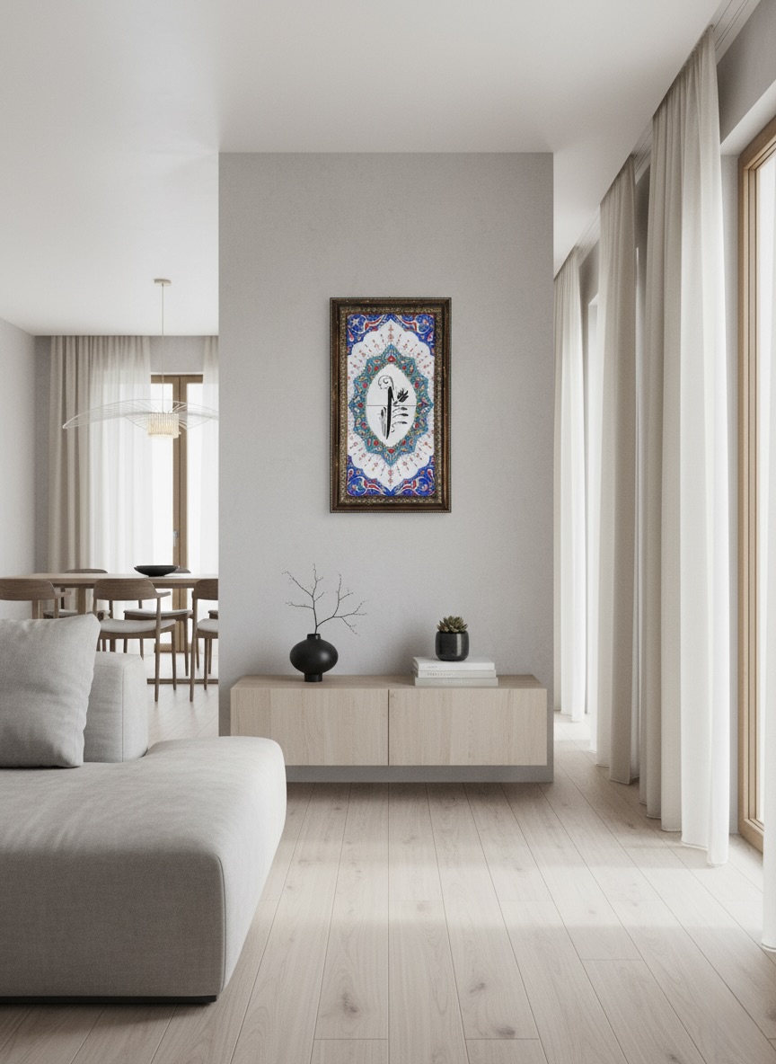Geleneksel sanatın ruhunu modern yaşam alanınıza taşıyın. Bu özel tasarım tablo, sadece bir dekorasyon parçası değil, asırlar süren bir medeniyetin ve inancın zarif bir yansımasıdır.