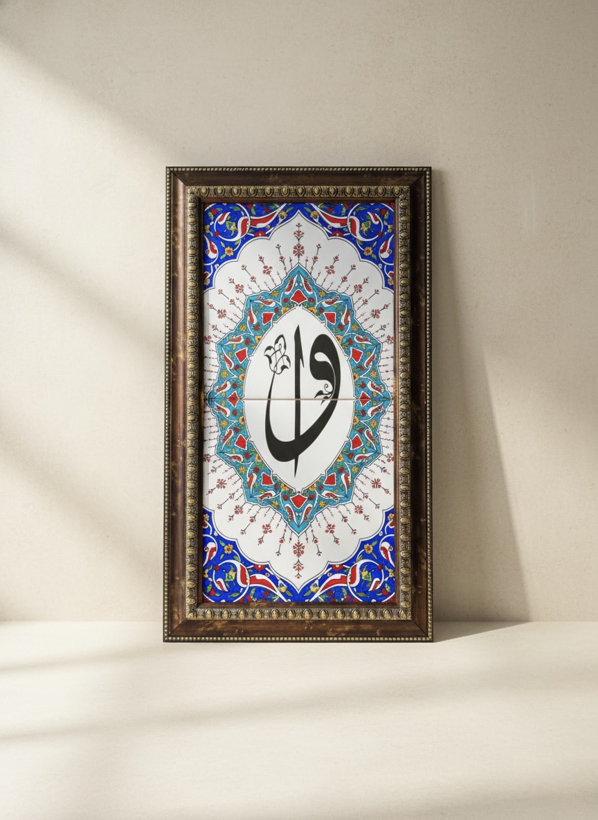 El Yapımı Ahşap Çerçeveli Çini Karo VavElif Yazılı Tablo