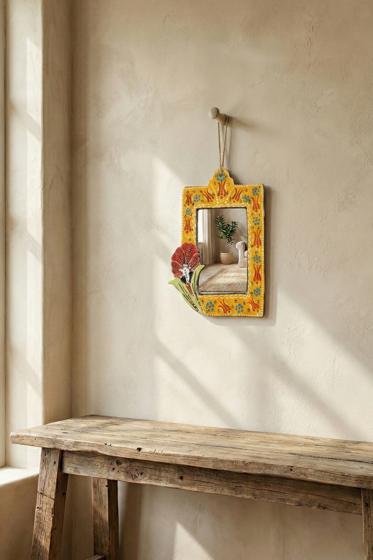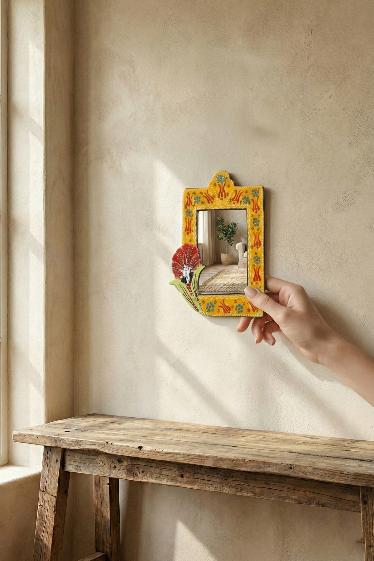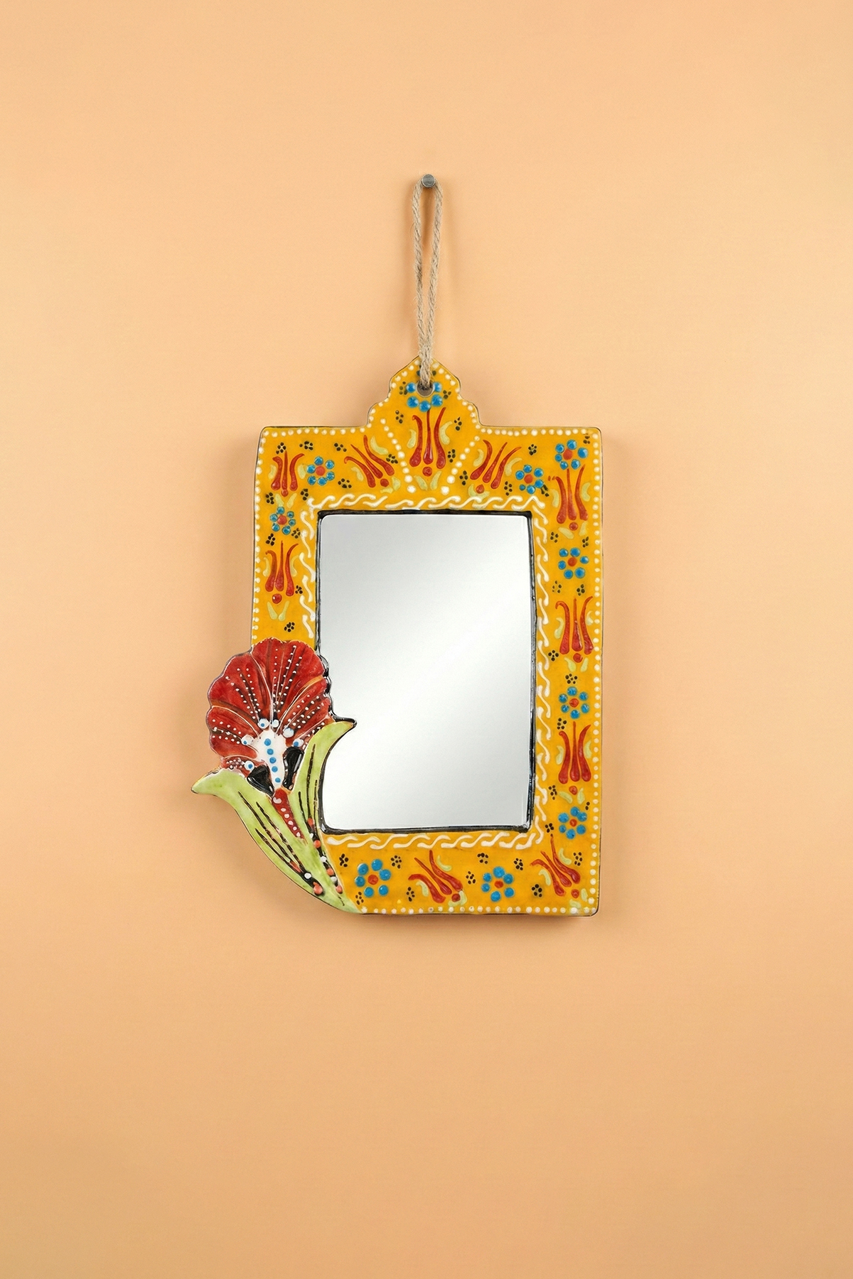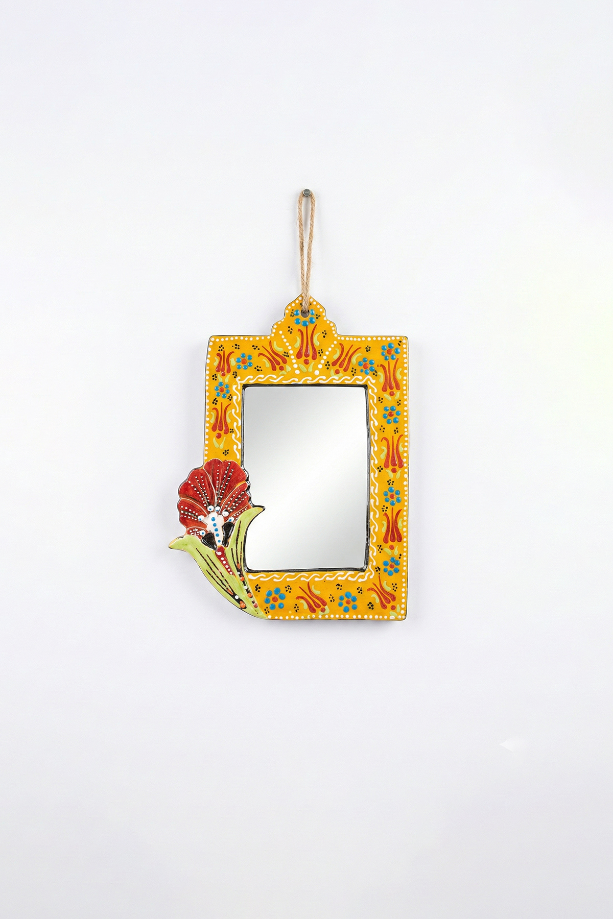 Evinizin en sade duvarını, geleneksel motiflerin ışıltısıyla bir sanat köşesine dönüştürün. El işçiliğiyle bezenmiş kabartma detayları ve solmayan canlı renkleriyle bu seramik çini ayna; antre, banyo veya salonunuza hem otantik bir şıklık hem de ferah bir derinlik katmak için tasarlandı.