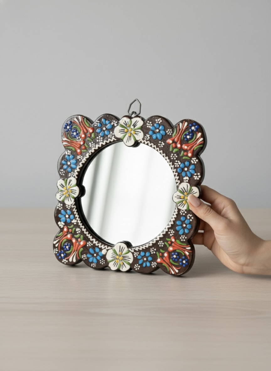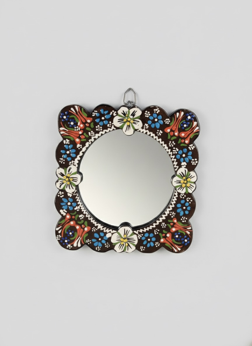 Evinizin en sade duvarını, geleneksel motiflerin ışıltısıyla bir sanat köşesine dönüştürün. El işçiliğiyle bezenmiş kabartma detayları ve solmayan canlı renkleriyle bu seramik çini ayna; antre, banyo veya salonunuza hem otantik bir şıklık hem de ferah bir derinlik katmak için tasarlandı.