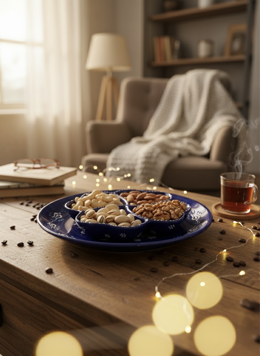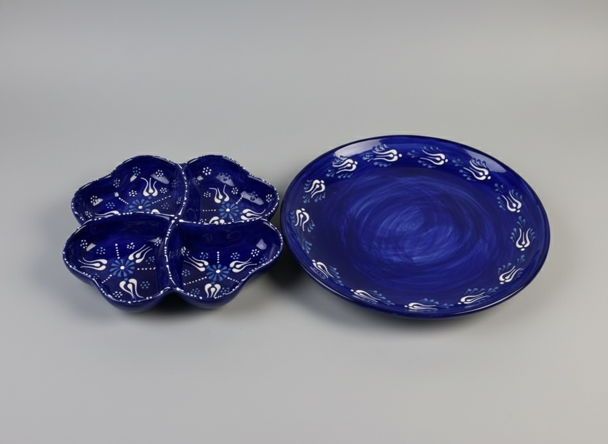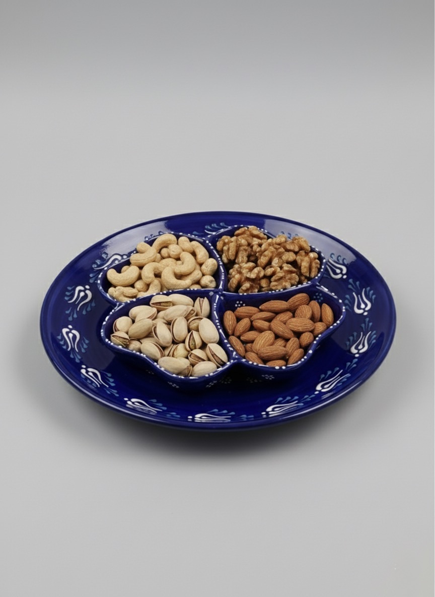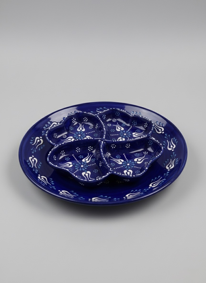 El Yapımı Mavi Çini Desenli Dört Bölmeli Servis Tabağı