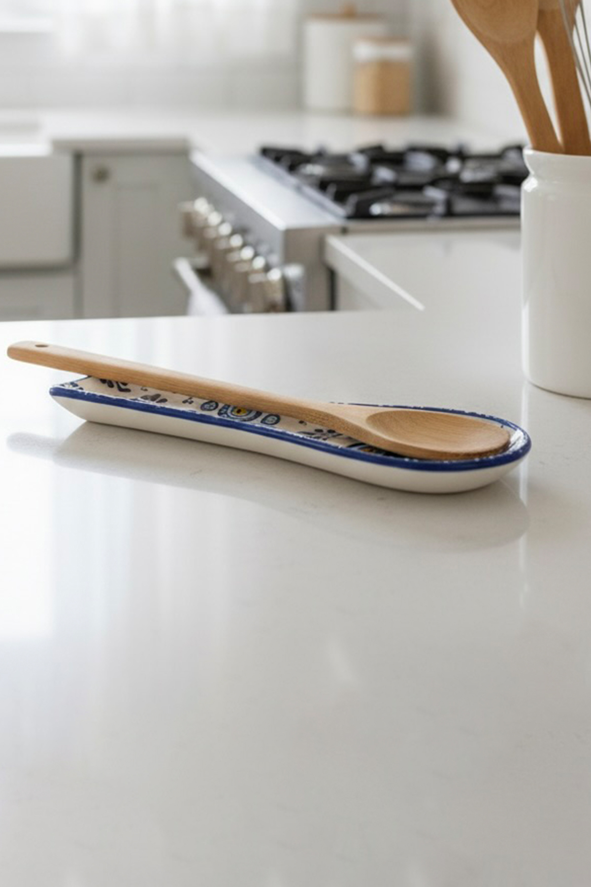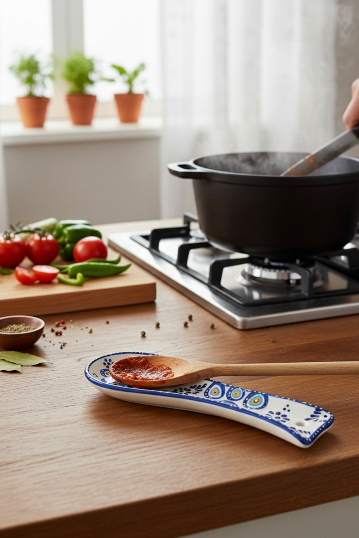 Bu eşsiz seramik kaşıklık, sadece bir mutfak aracı değil, aynı zamanda bir sanat eseri. Canlı renkleri ve geleneksel desenleriyle mutfağınıza neşe ve otantik bir hava katın.