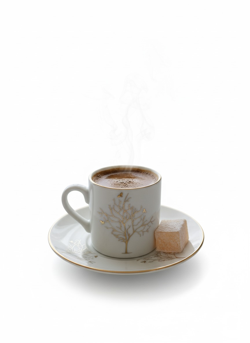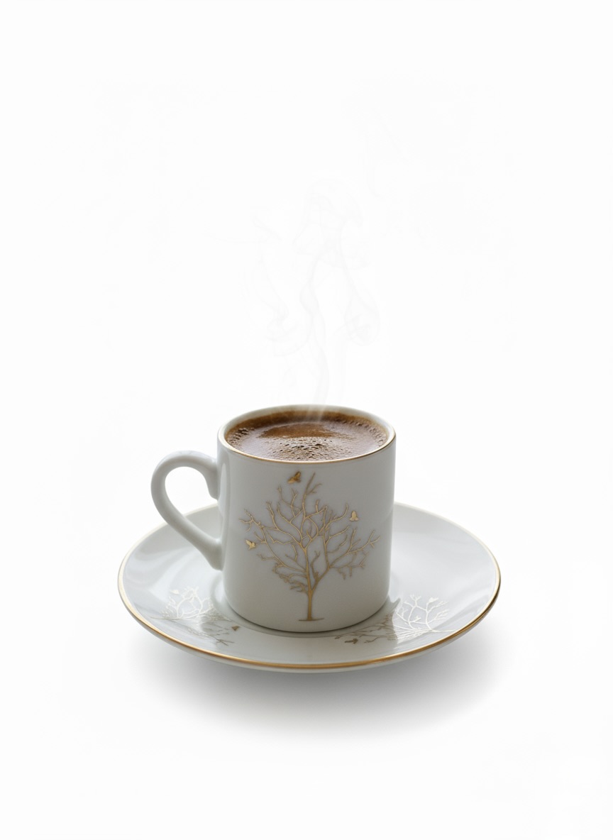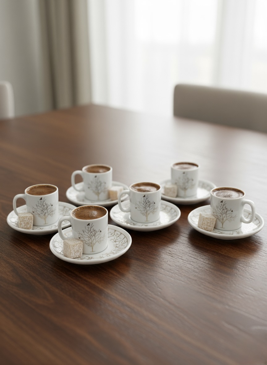 Altın yaldız işlemeli Hayat Ağacı serisiyle kahve keyfinizi taçlandırın. 6 kişilik bu zarif takım, şıklığı ve manevi değeriyle sofranızın ve çeyizinizin baş tacı olmaya aday.