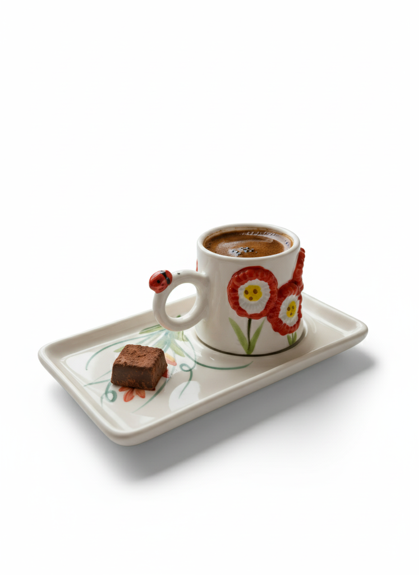 Kırmızı Çiçekli El Yapımı Tek Kişilik 2 Parça Seramik Kahve Fincan Seti
