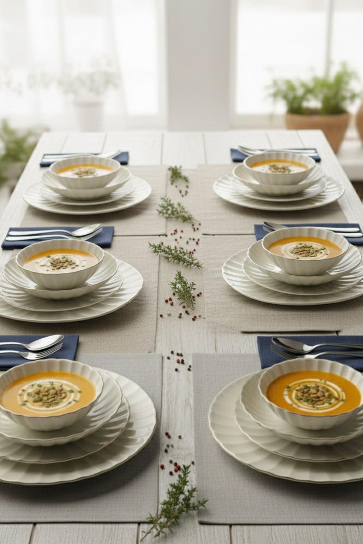 Boyut: Servis tabağı (26 cm), Yemek tabağı (20 cm), Pasta tabağı (19 cm), Çorba kasesi (14 cm) boyutlarındadır.