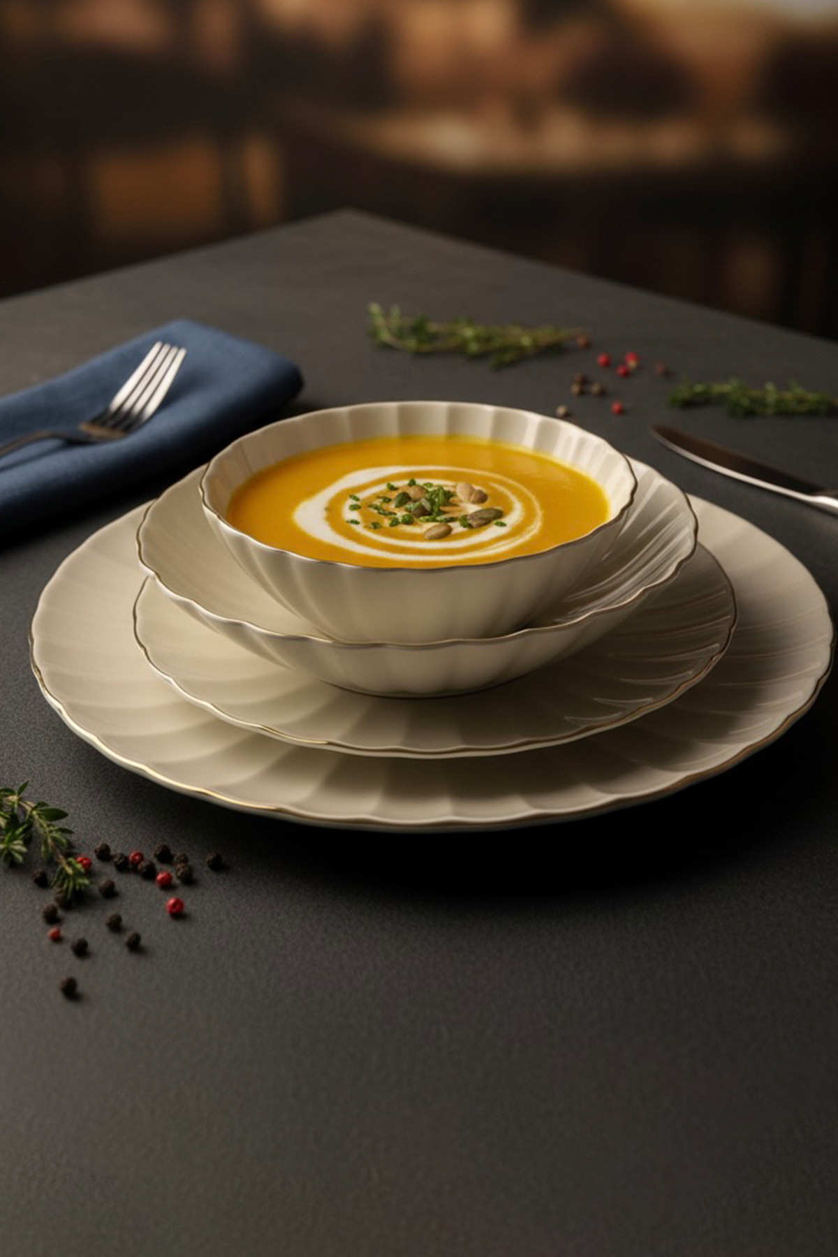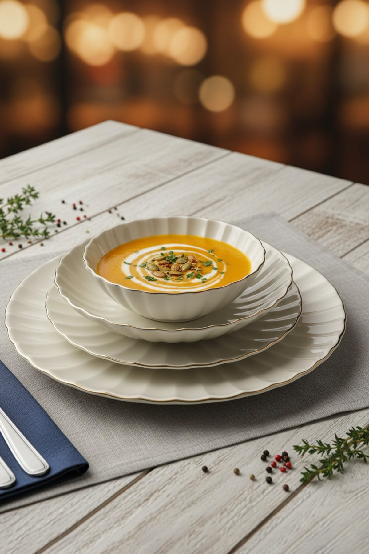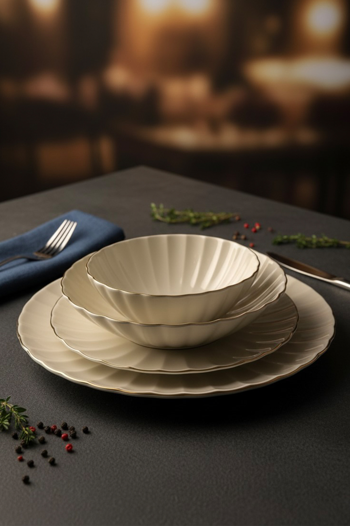 Yemek sunumlarınız için ihtiyacınız olan her şey, altın şıklığıyla tek bir kutuda. Porreal Porselen kalitesiyle üretilen bu 6 kişilik (24 parça) yemek takımı; çorba kasesinden servis tabağına kadar eksiksiz bir set sunar. Porselenin pürüzsüz dokusu ve kenarlarındaki zarif gold şeritler, her öğünü özel bir davete dönüştürmek için tasarlandı.
